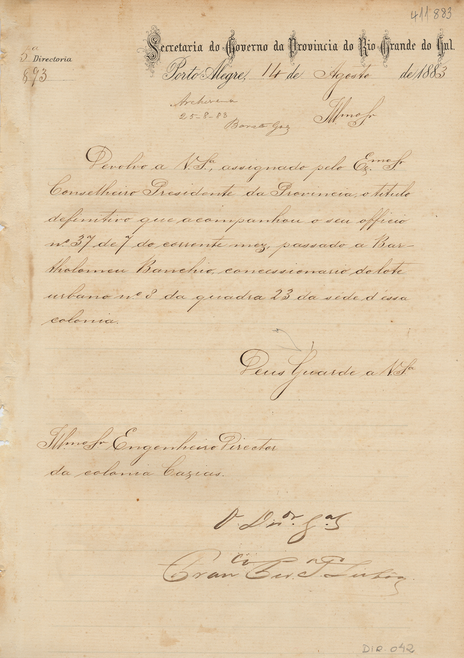Da Secretaria do Governo da Província do RS - 5ª Diretoria - Francisco Pereira Lisbôa, para o Engenheiro Diretor da Colônia Caxias. Assunto: comunica devolução do título definitivo do lote urbano nº 8, quadra 23 dessa colônia, passado à Bartolomeu Banchio. Local: Porto Alegre.