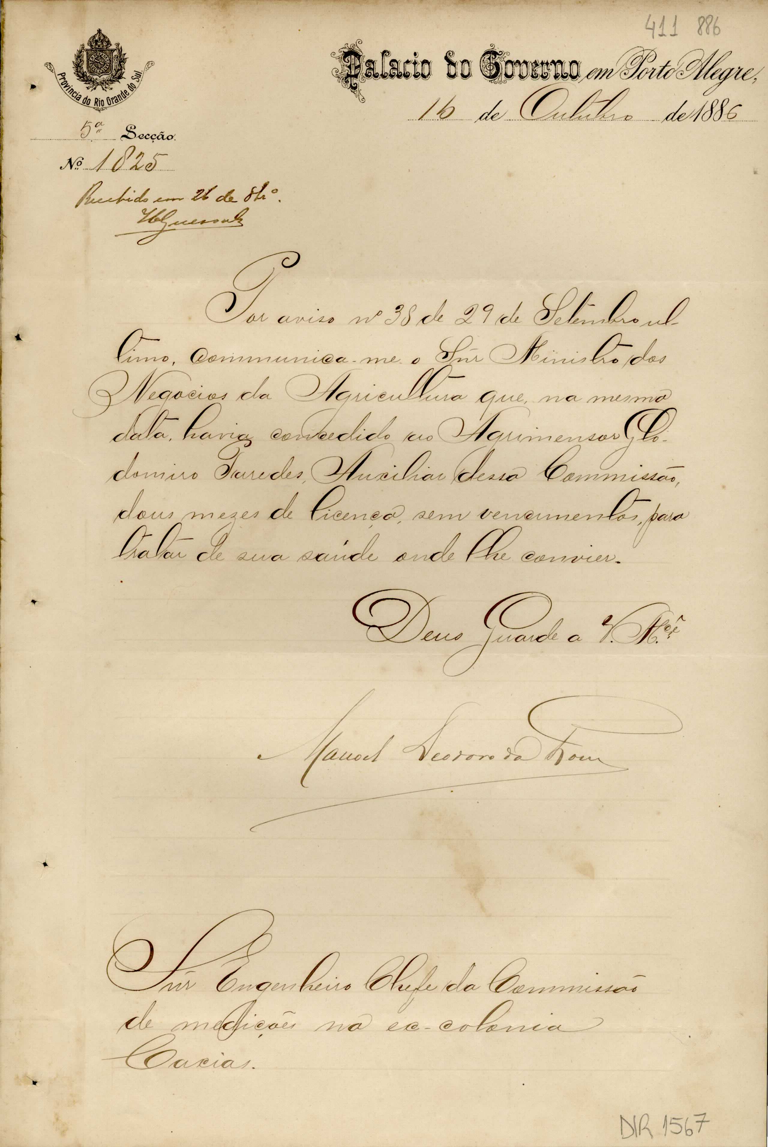 De Manoel Deodoro - Palácio do Governo em Porto Alegre, 5ª Seção, para Henrique da Silva Guerra - Engenheiro Chefe da Comissão de Medição de Lotes em Caxias e Juiz Comissário de medições. Assunto: comunica concessão de licença ao agrimensor Glodomiro Paredes, auxiliar da Comissão.