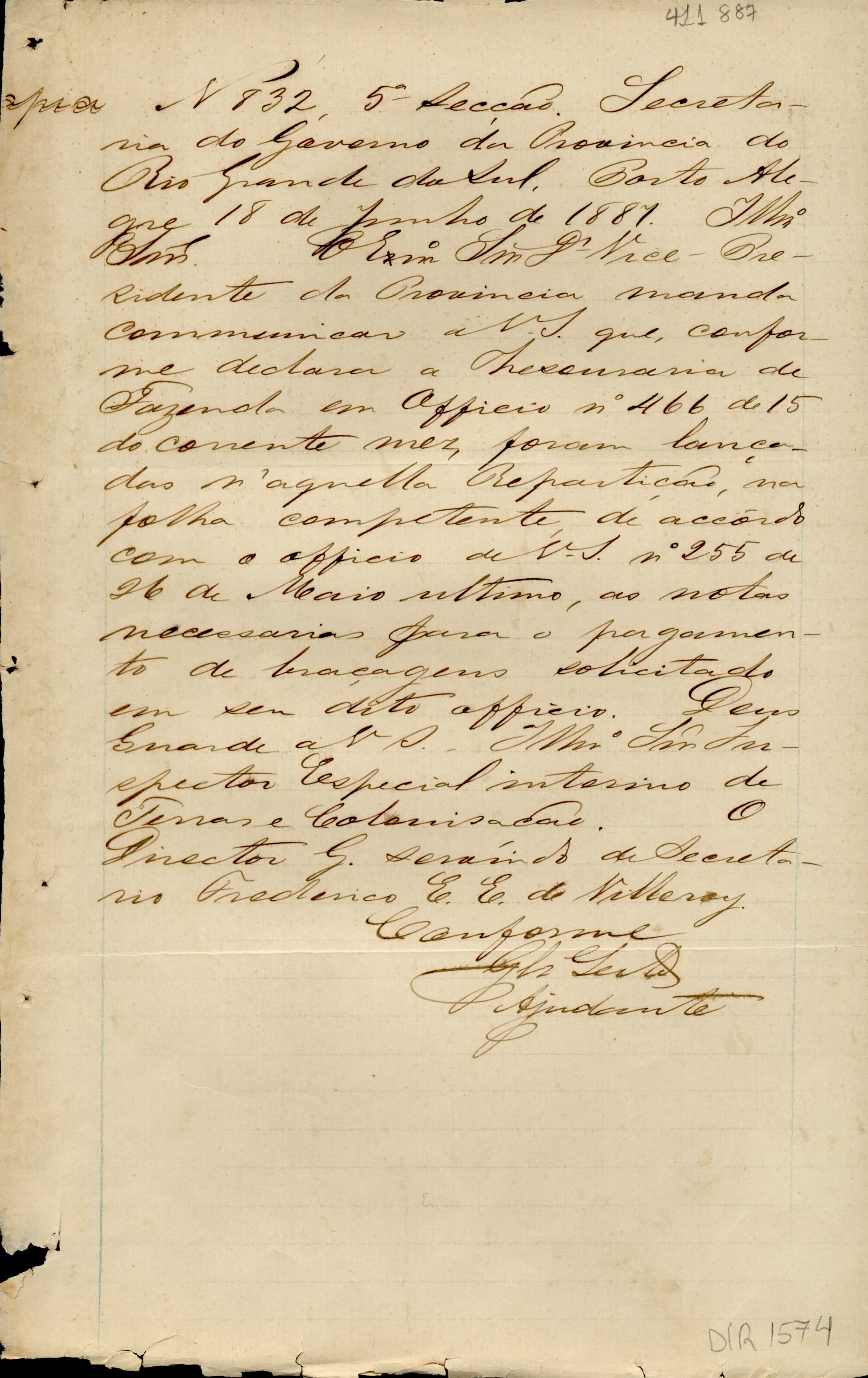 De Frederico E. E. de Villeroy - Diretor Geral da Secretaria do Governo da Província do Rio Grande do Sul, Porto Alegre, para o Inspetor Especial Interino de Terras e Colonização. Assunto: informações sobre o pagamento das braçagens.