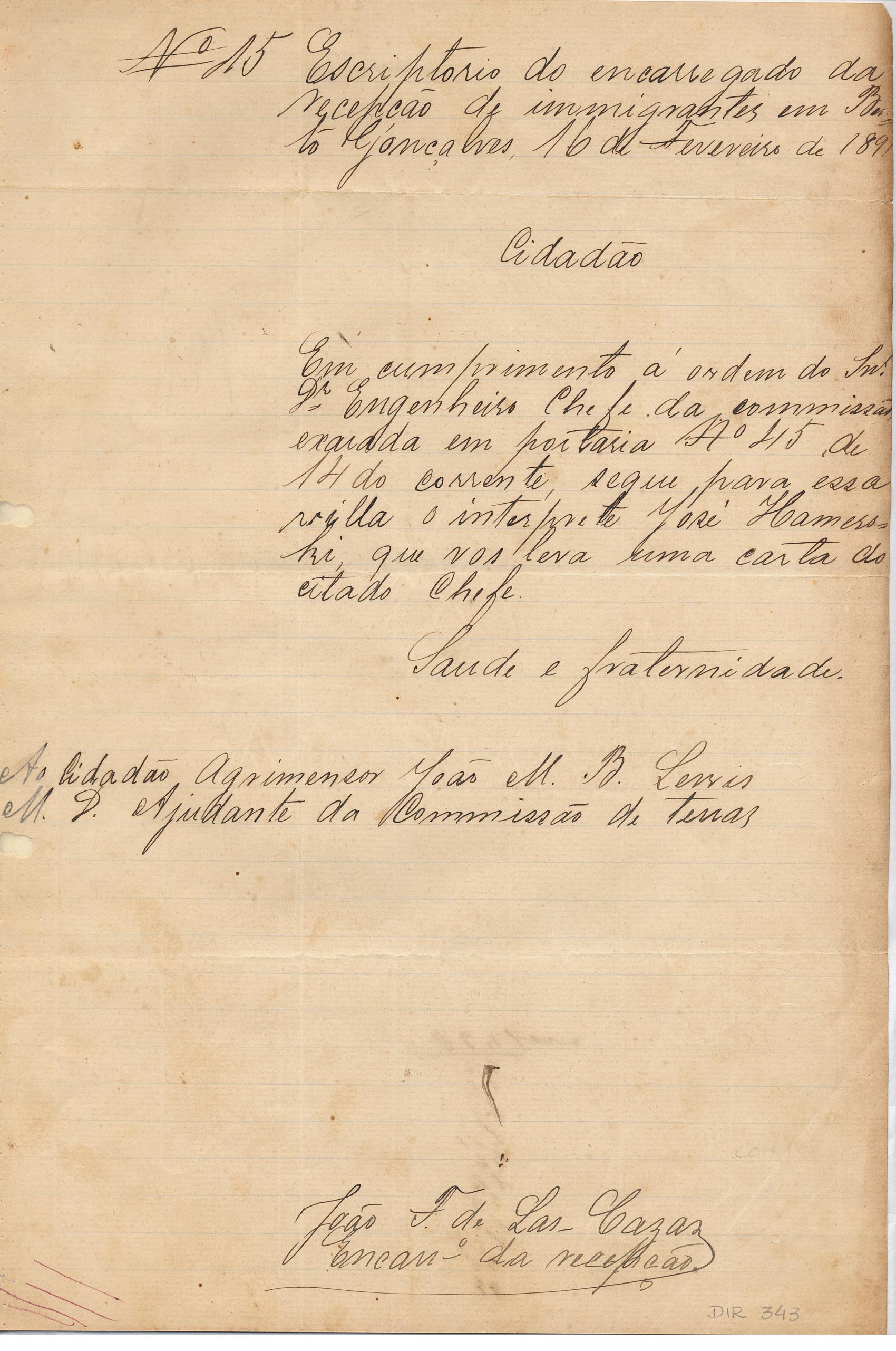 De João F. de Las Cazas - Encarregado da recepção dos imigrantes em Bento Gonçalves, para João Manoel B. Lewis - Ajudante da Comissão de Terras em Caxias. Assunto: comunica a ida para Caxias do intérprete José Hameski.
