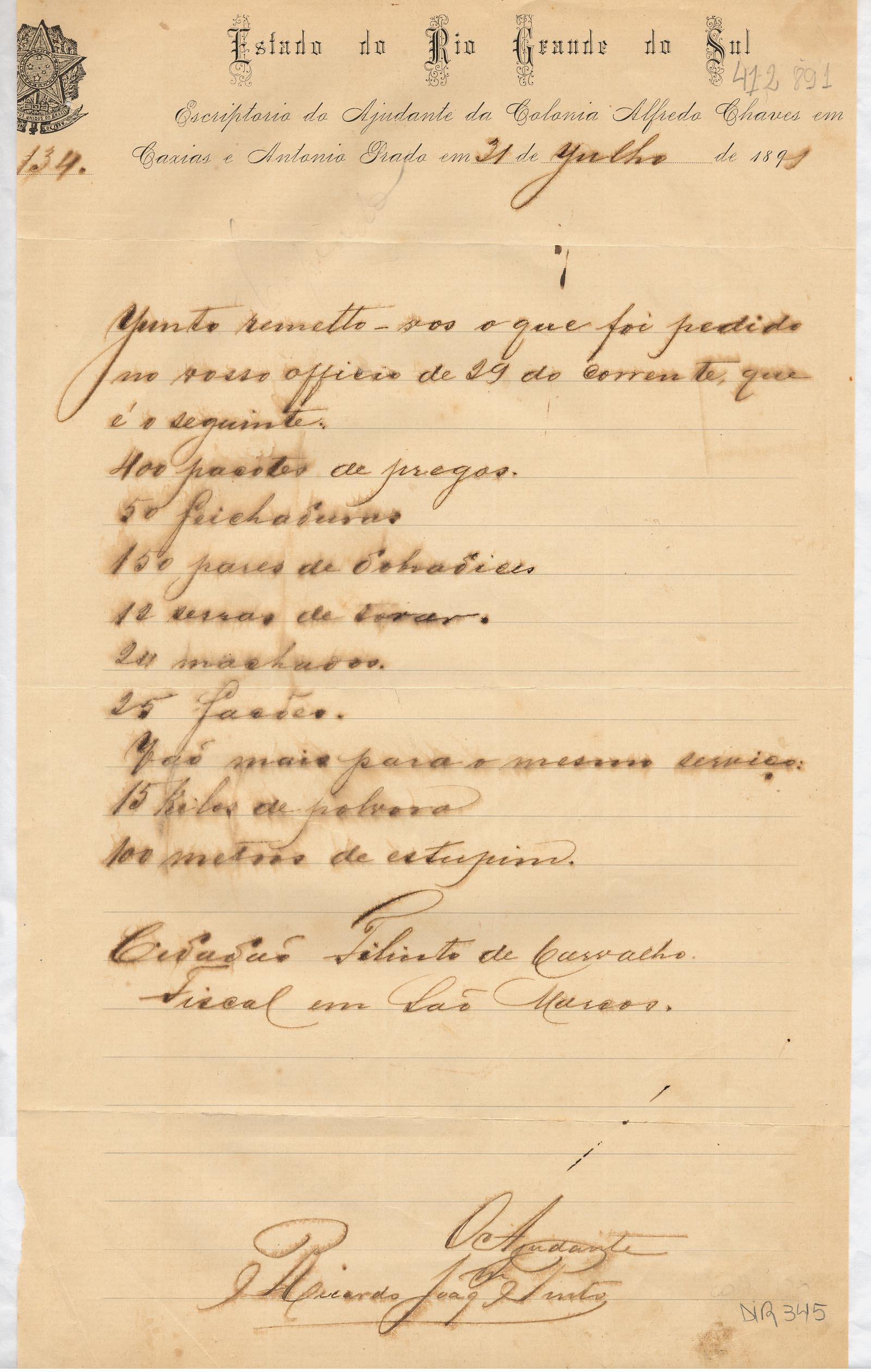 De Ricardo João Pinto - Ajudante da Comissão das colônias Alfredo Chaves, Caxias e Antonio Prado, para Filinto de Carvalho - Fiscal da colônia São Marcos. Assunto: comunica envio de materiais que foram solicitados na relação.