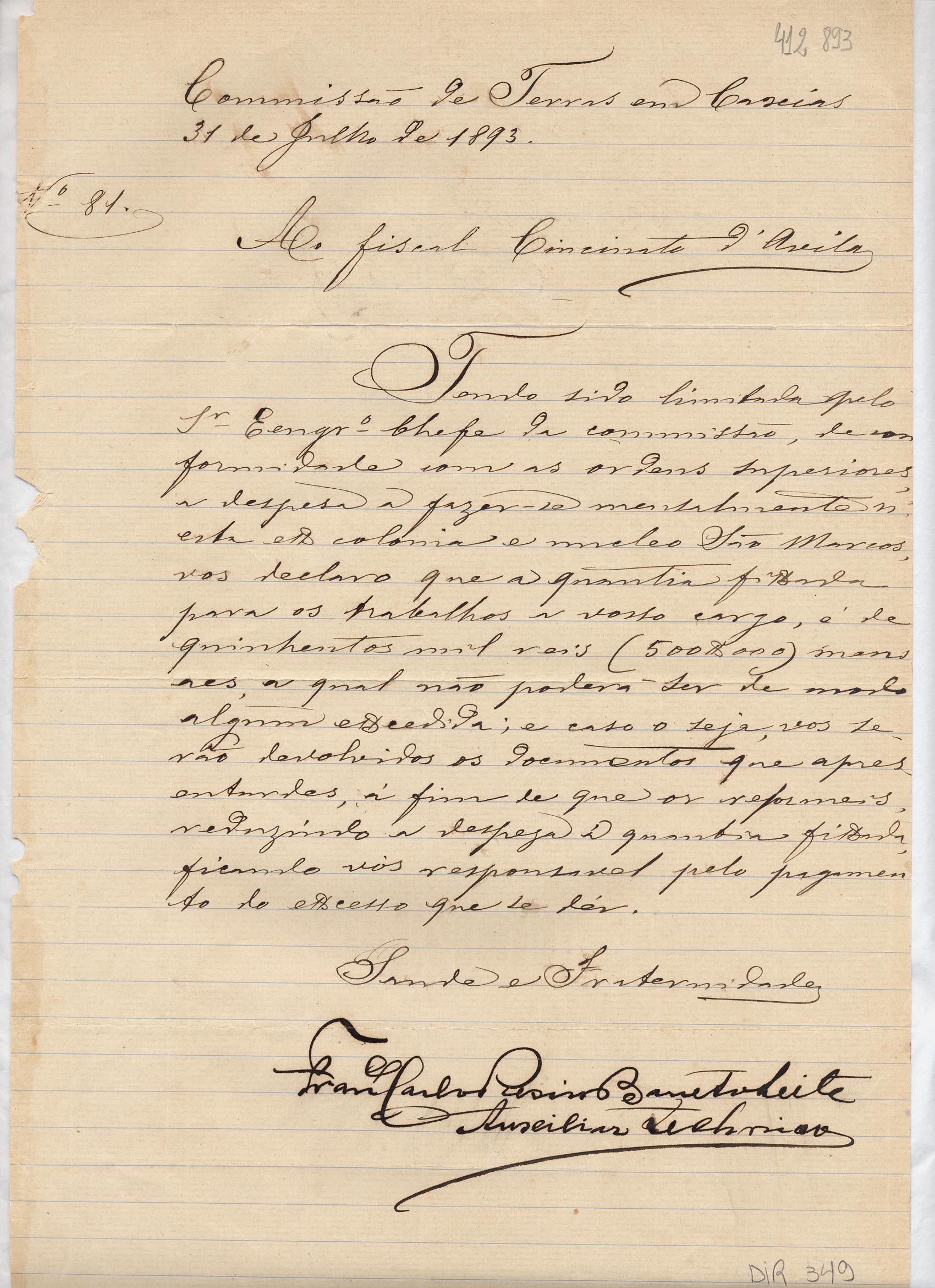 De Francisco C. R. B. Leite - Auxiliar técnico da Comissão de Terras em Caxias para Cincinato D'Avilla - Fiscal da Comissão de Medição de Lotes e Terras em Caxias. Assunto: recomenda que não excedam a quantia fornecida, as despesas com os trabalhos de melhoramentos na ex-Colônia Caxias e núcleo São Marcos.