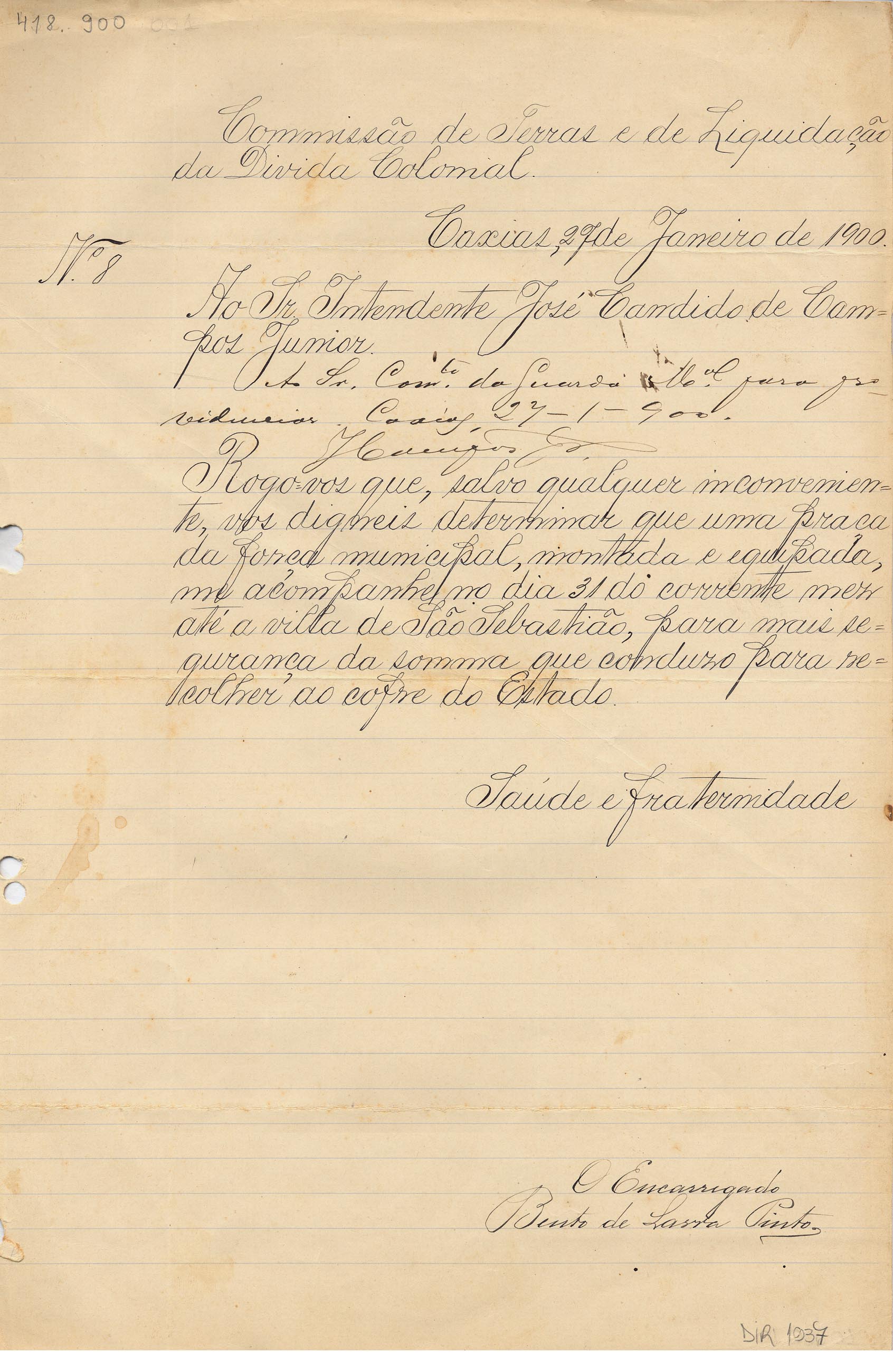 De Bento de Lavra Pinto - Encarregado da Comissão de Terras e de Liquidação da Dívida Colonial, para José Candido de Campos Júnior - Intendente. Assunto: solicita acompanhamento de "uma praça da força municipal, montada e equipada" no dia 31 do corrente mês, para condução de "soma" ao cofre do Estado, na vila de São Sebastião.