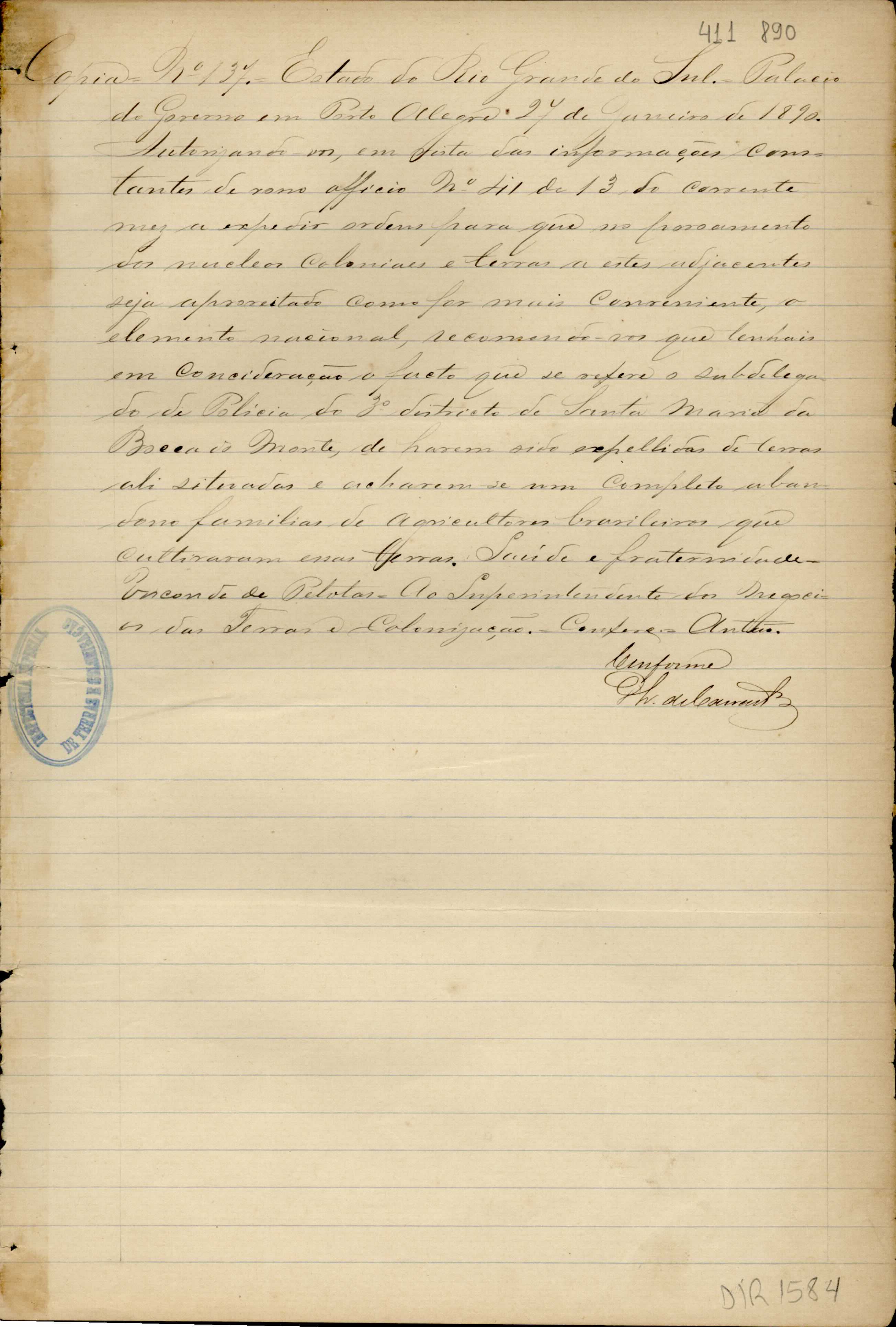 De Visconde de Pelotas - Governador, Palácio do Governo em Porto Alegre, para o Superintendente dos Negócios das Terras e Colonização. Assunto: instruções para colocar agricultores brasileiros no povoamento dos núcleos coloniais.