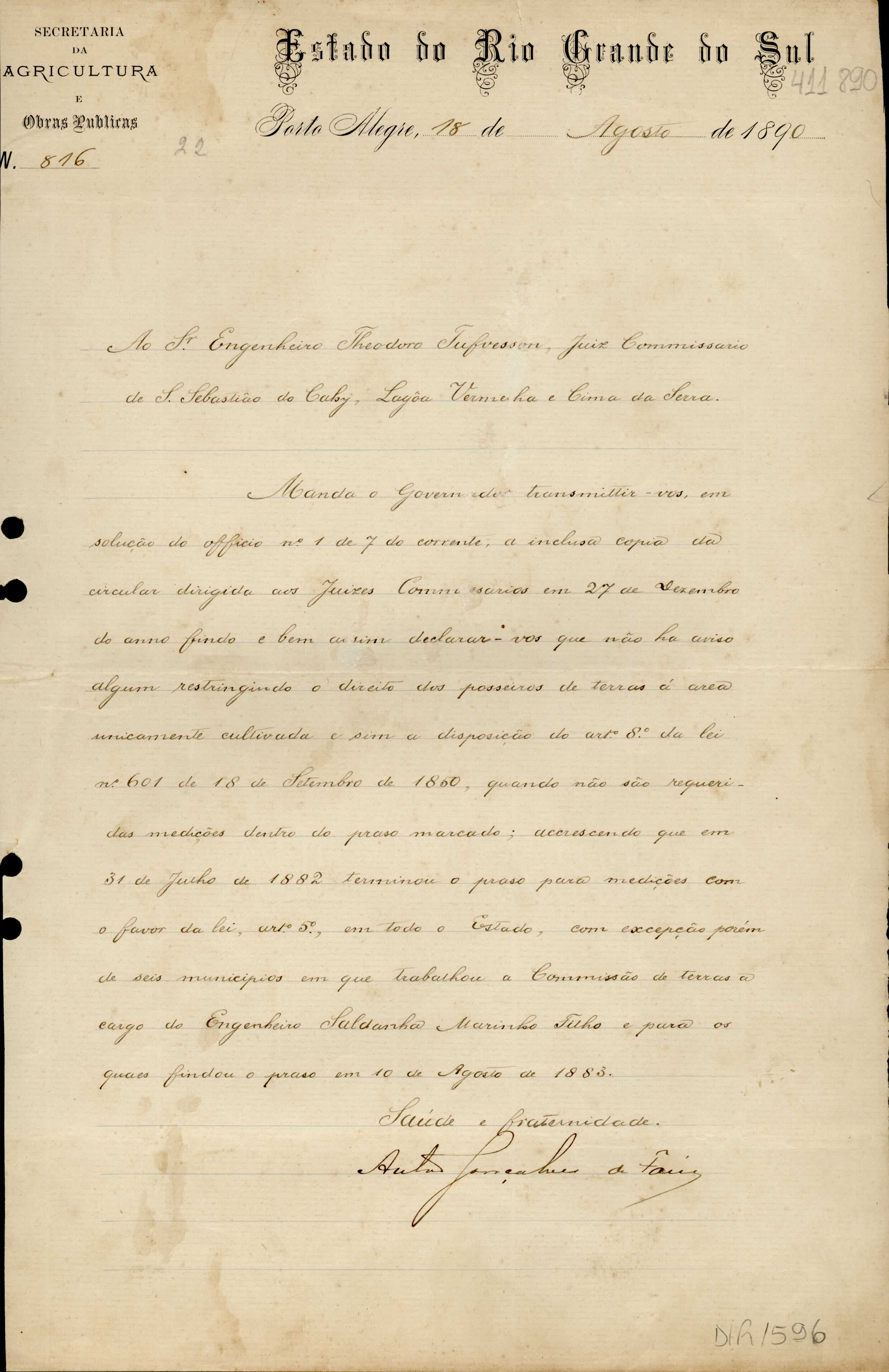 De Antão Gonçalves de Faria - Secretaria da Agricultura e Obras Públicas do RS, em Porto Alegre, para o Eng. Teodoro Tufvesson - Juiz Comissário de S. Sebastião do Caí, Lagoa Vermelha e Cima da Serra. Assunto: transmite solução de ofício / informações sobre o direito dos posseiros de terras / aviso do término do prazo para medições, com exceção dos municípios onde trabalhou a Comissão do Engenheiro Saldanha Marinho Filho.