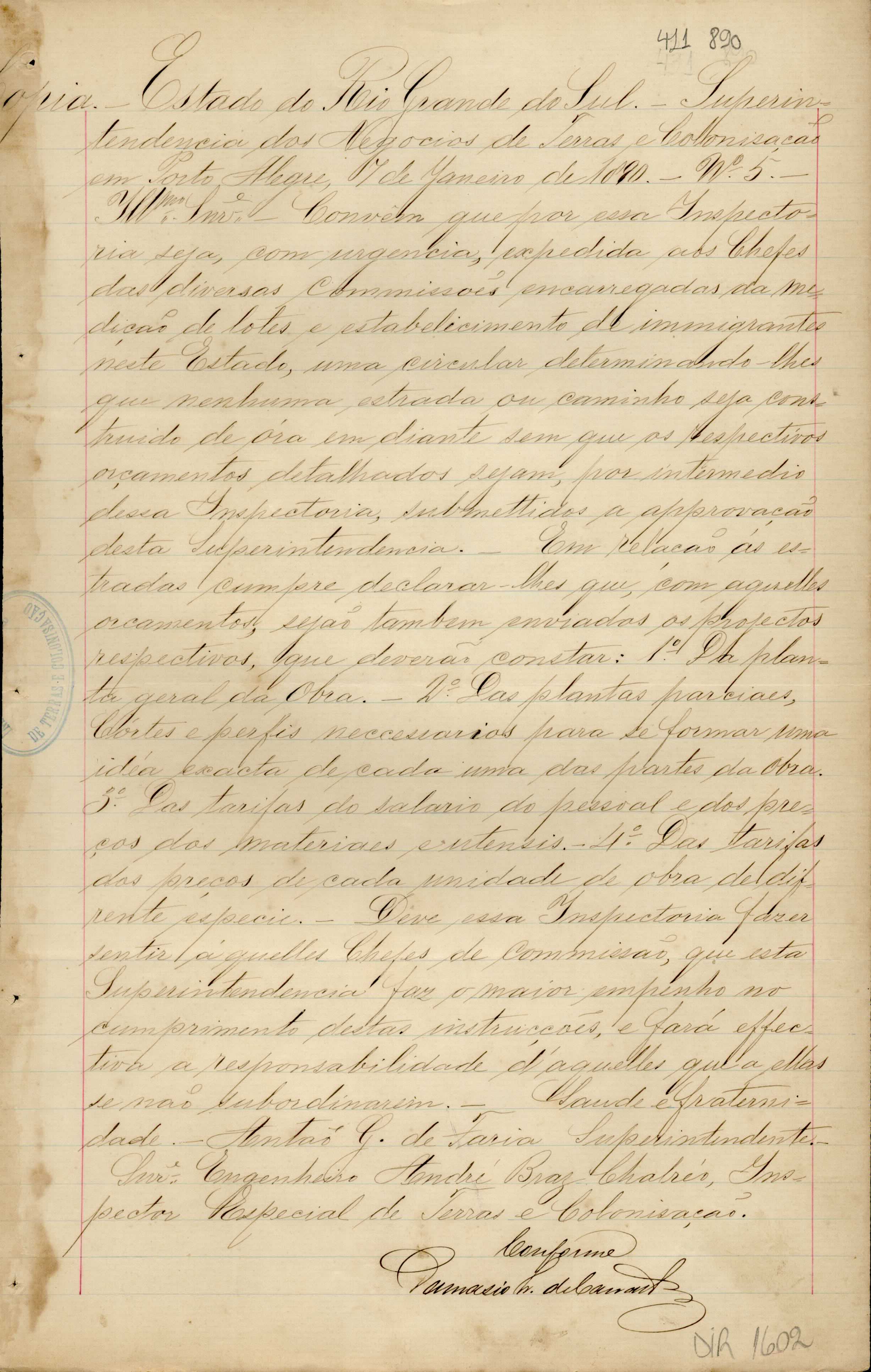 De Antão G. de Faria - Superintendente dos Negócios de Terras e Colonização em Porto Alegre, para André Braz Chalréo - Inspetor Especial de Terras e Colonização. Assunto: informa que a construção de estradas ou caminhos só pode ser realizada após o envio e aprovação dos orçamentos detalhados / solicita a remessa dos projetos, junto com os orçamentos.