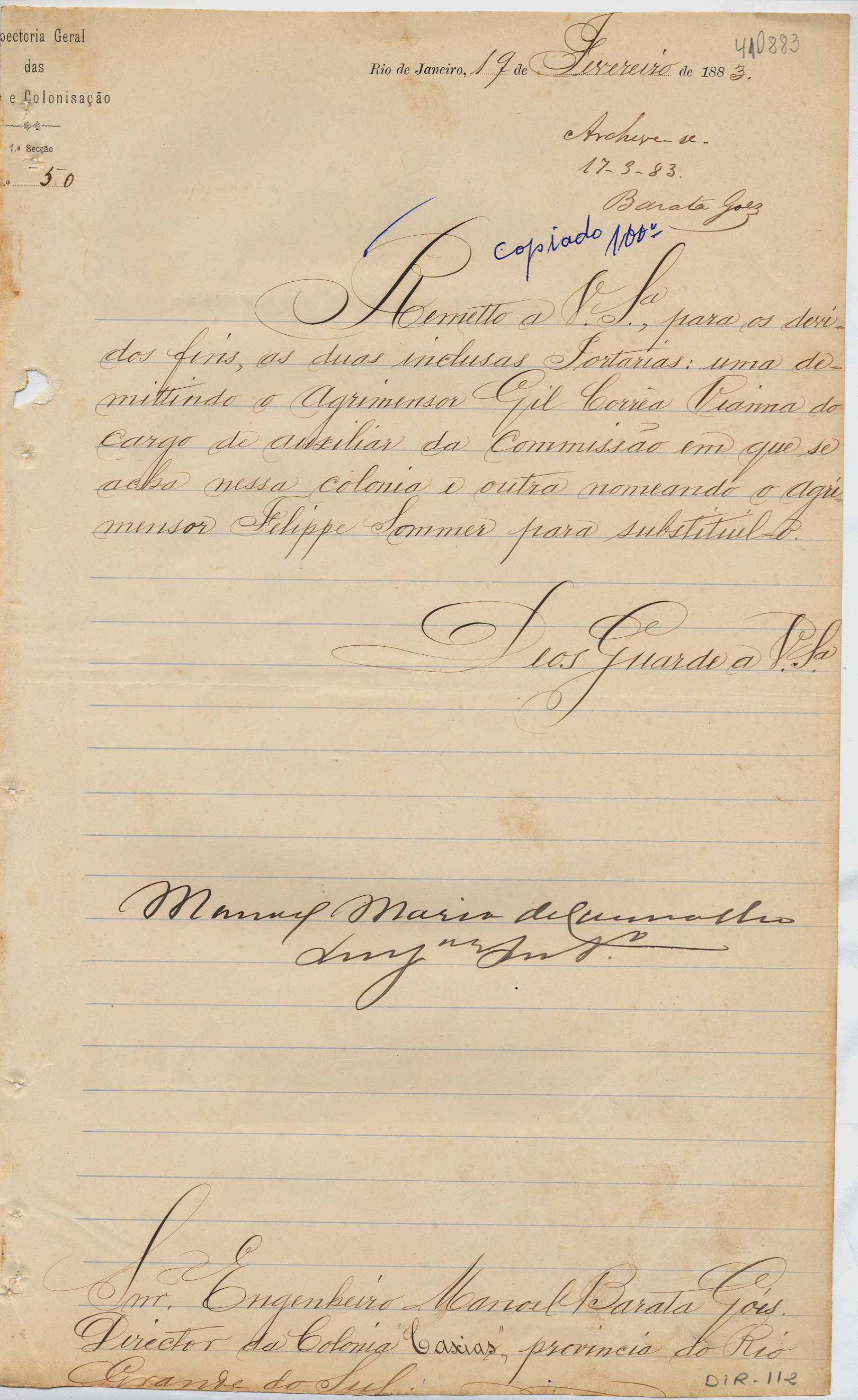 Da Inspetoria Geral das Terras e Colonização - 1ª seção - Manuel Maria de Carvalho, para o Engenheiro Manoel Barata Góes - Diretor da Colônia Caxias. Assunto: comunica envio de portaria de demissão do agrimensor Gil Corrêa Vianna, do cargo de auxiliar da comissão; e portaria de nomeação do agrimensor Felippe Sommer para substituí-lo.