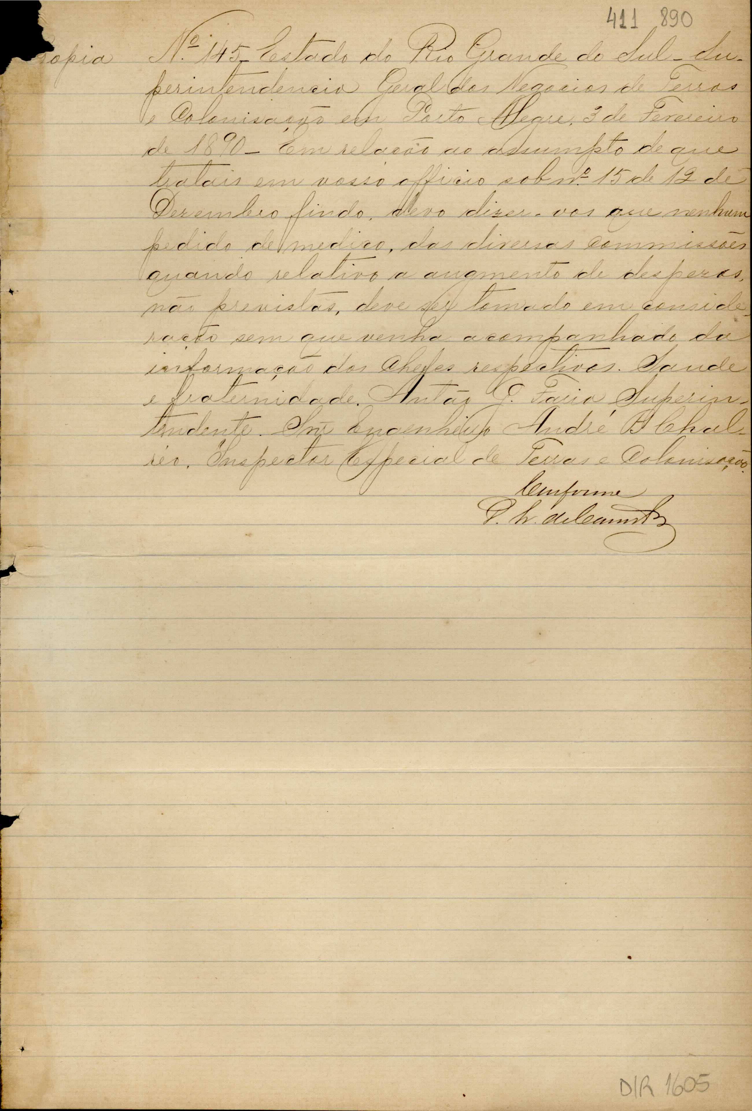 De Antão G. de Faria - Superintendente dos Negócios de Terras e Colonização em Porto Alegre, para André Braz Chalréo - Inspetor Especial de Terras e Colonização. Assunto: instruções sobre os pedidos dos médicos das diversas comissões.