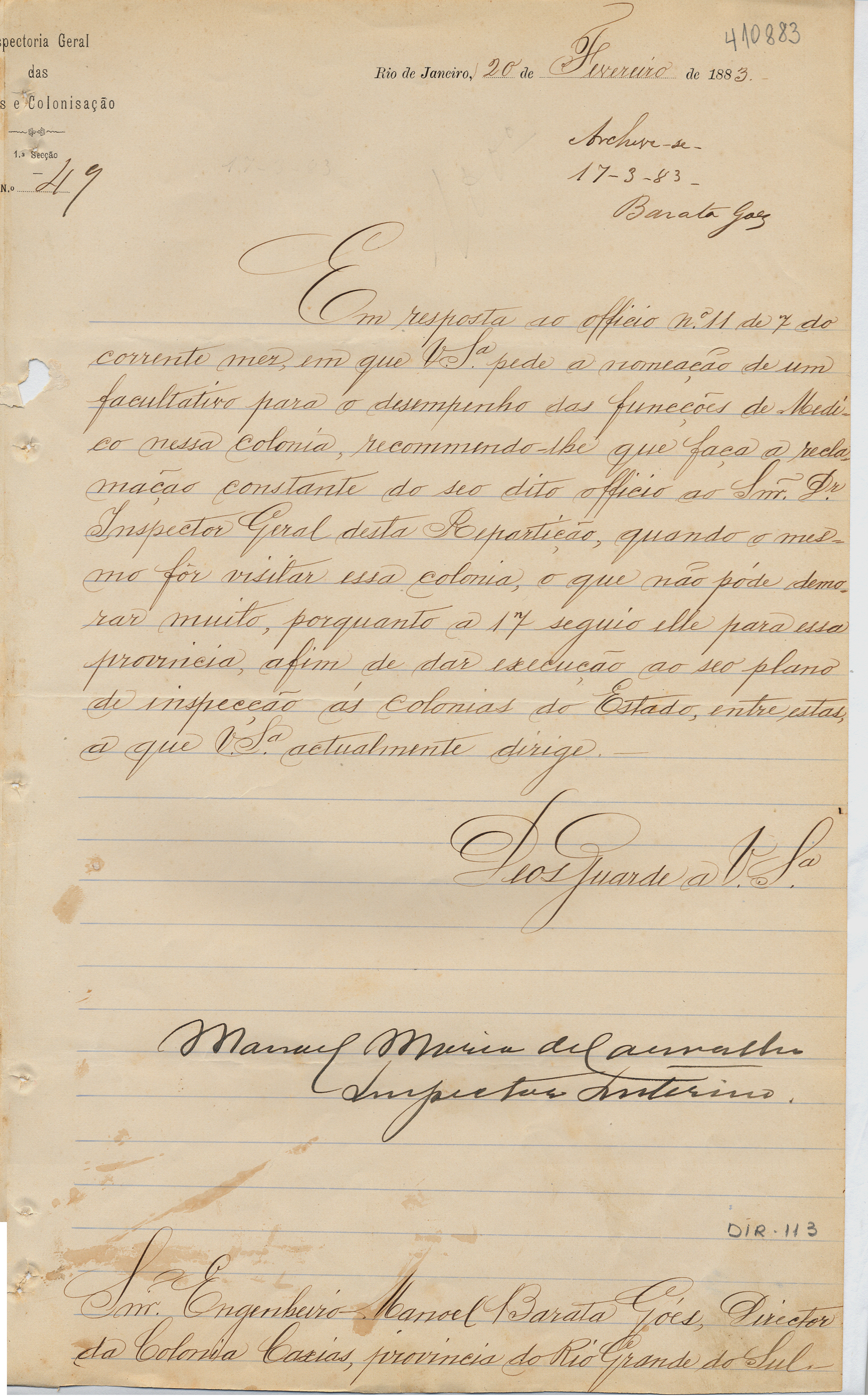 Da Inspetoria Geral das Terras e Colonização - 1ª seção - Manuel Maria de Carvalho - Inspetor interino, para o Engenheiro Manoel Barata Góes - Diretor da Colônia Caxias. Assunto: informa a respeito do pedido de nomeação de um facultativo para a função de médico na colônia.