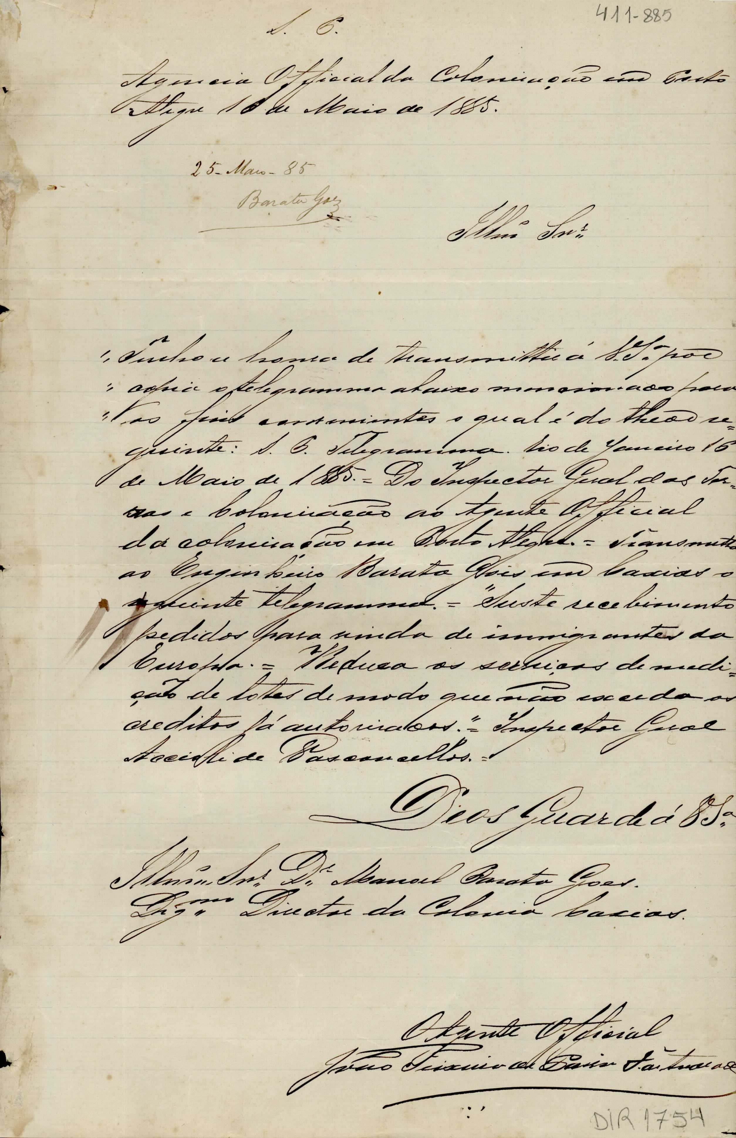 De João Teixeira de Paiva F. de Andrade - Agente Oficial da Colonização em Porto Alegre, para Manoel Barata Góes - Diretor da Colônia Caxias. Assunto: apresenta cópia do telegrama do Inspetor Geral das Terras e Colonização - RJ, solicitando redução dos serviços de medição e diminuição dos custos.