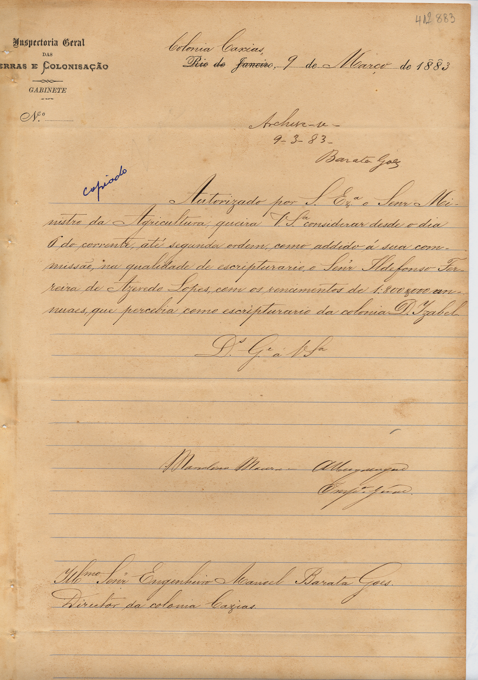 Da Inspetoria Geral das Terras e Colonização - Gabinete - Colônia Caxias - Marcolino Moura Albuquerque, para o Engenheiro Manoel Barata Góes - Diretor da Colônia Caxias. Assunto: comunica nomeação para cargo de escriturário, adido à comissão, de Ildefonso Ferreira de Azevedo Lopes.