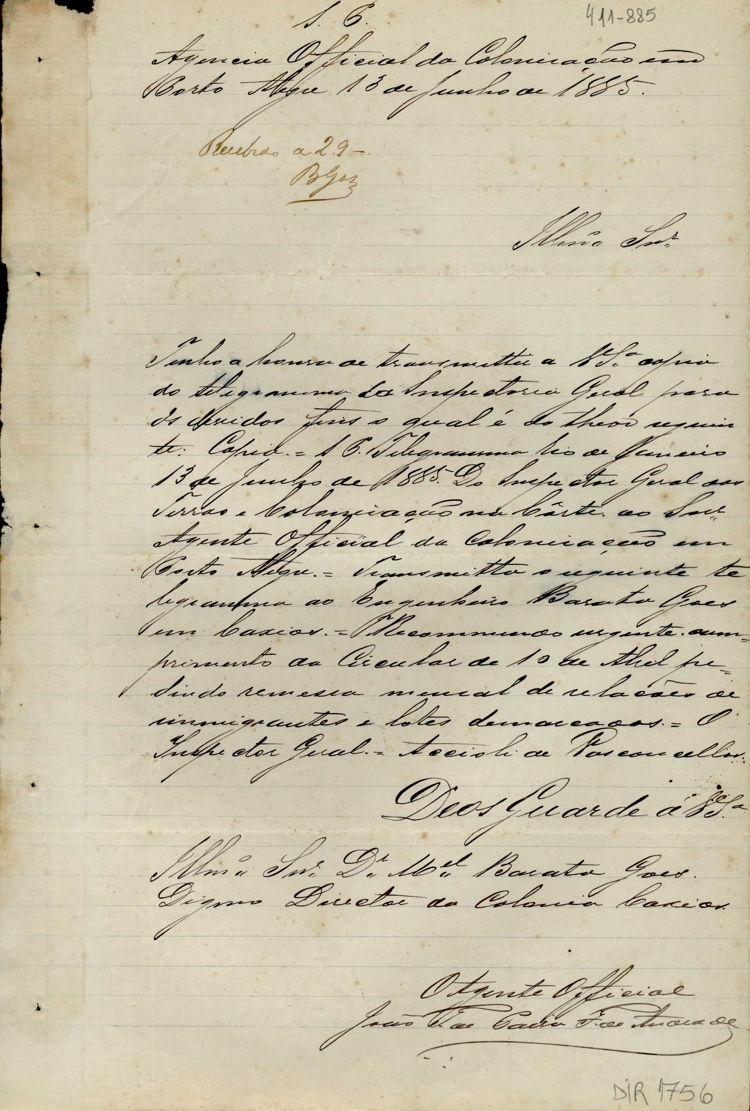 De João Teixeira de Paiva F. de Andrade - Agente Oficial da Colonização em Porto Alegre, para Manoel Barata Góes - Diretor da Colônia Caxias. Assunto: apresenta cópia do telegrama do Inspetor Geral das Terras e Colonização - RJ, solicitando envio do memorial de relações de imigrantes e lotes demarcados.