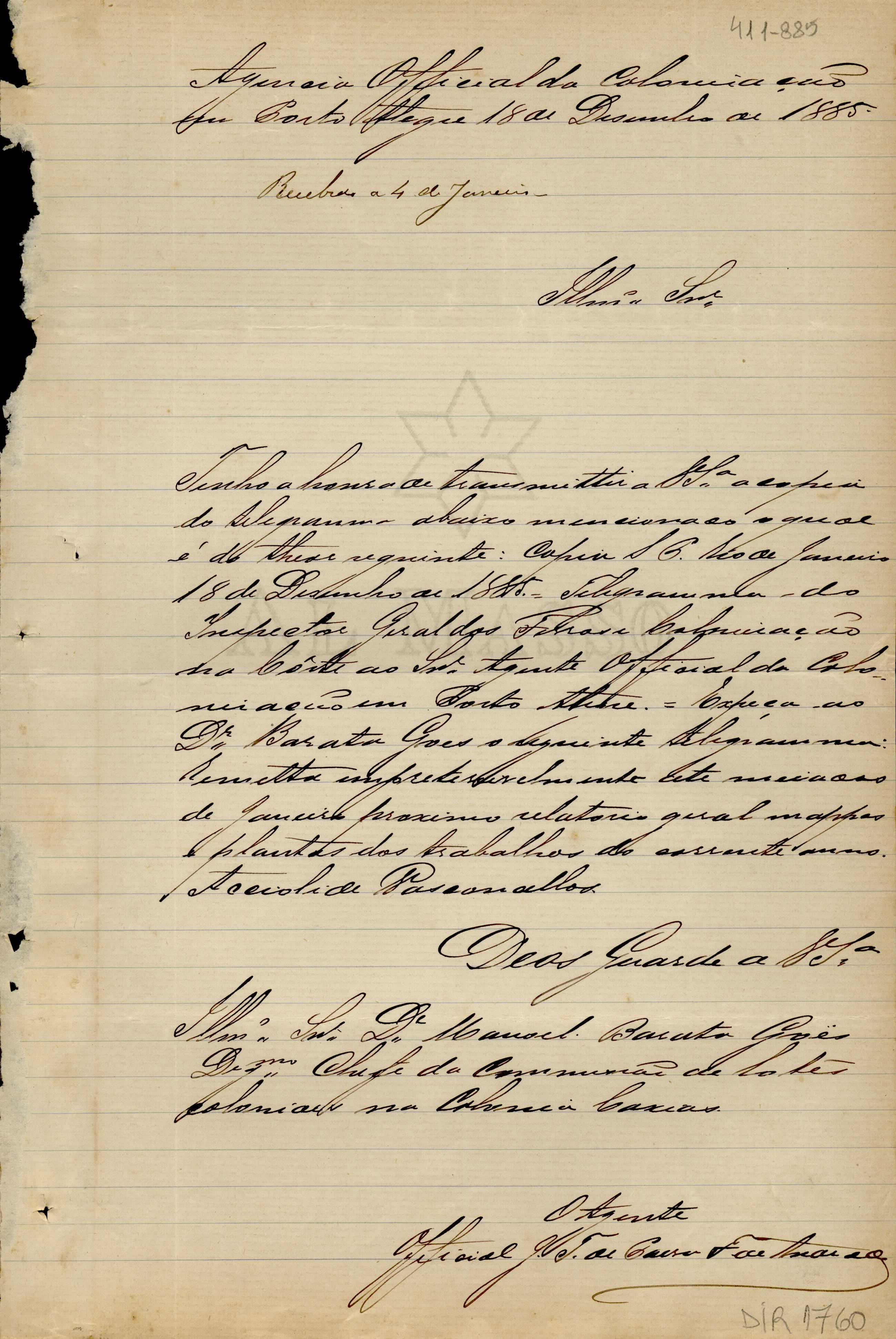 De João Teixeira de Paiva F. de Andrade - Agente Oficial da Colonização em Porto Alegre, para Manoel Barata Góes - Chefe da Comissão de Lotes coloniais na Colônia Caxias. Assunto: apresenta cópia do telegrama do Inspetor Geral das Terras e Colonização - RJ, solicitando remessa do relatório geral, mapas e plantas.