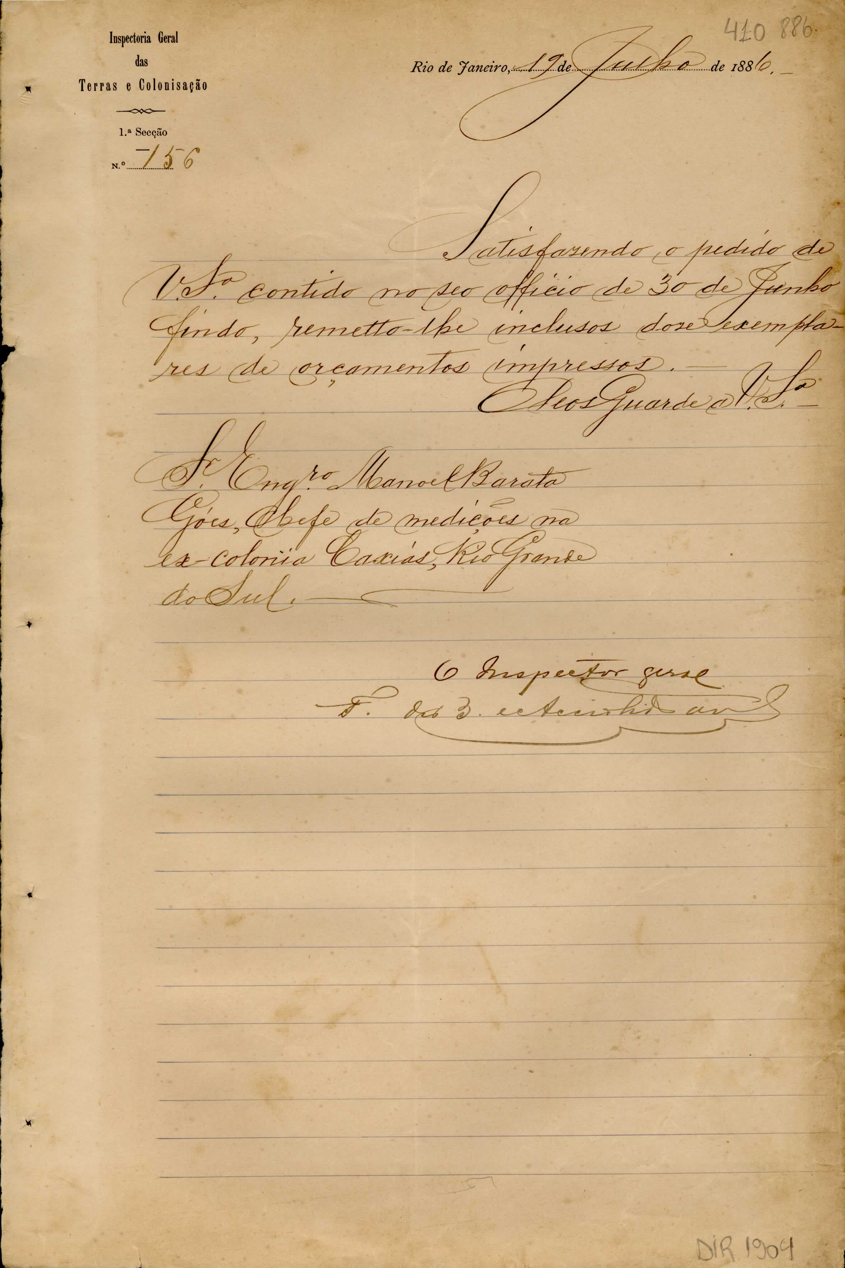 De Francisco de Barros e Accioli de Vasconcellos - Inspetor Geral das Terras e Colonização no RJ, para Manoel Barata Góes - Engenheiro Chefe de Medições na ex-Colônia Caxias. Assunto: comunica a remessa de exemplares de orçamentos impressos.