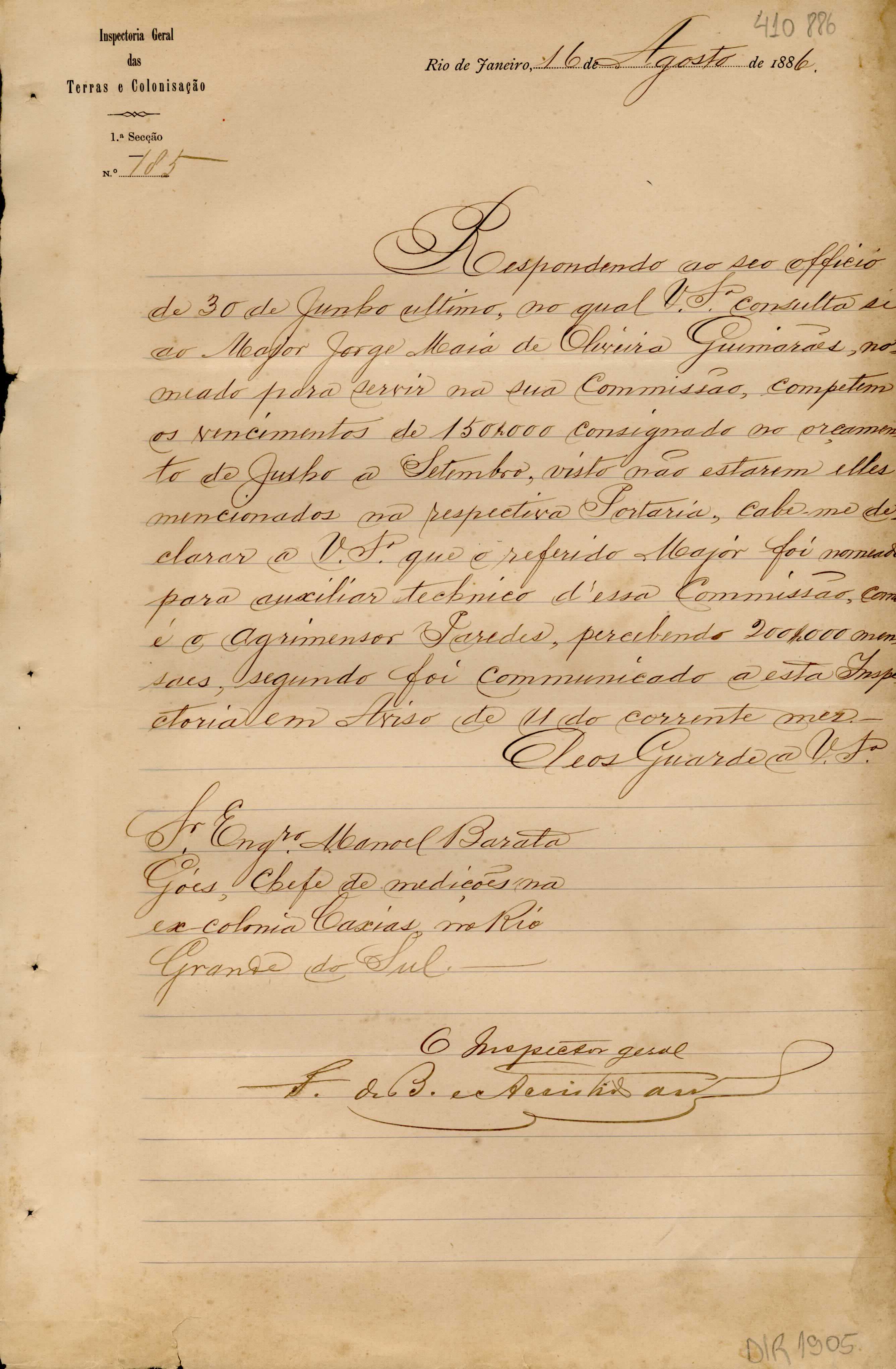 De Francisco de Barros e Accioli de Vasconcellos - Inspetor Geral das Terras e Colonização no RJ, para Manoel Barata Góes - Engenheiro Chefe de Medições na ex-Colônia Caxias. Assunto: instruções sobre o pagamento do Major Jorge Maia de Oliveira Guimarães, nomeado auxiliar técnico da Comissão.