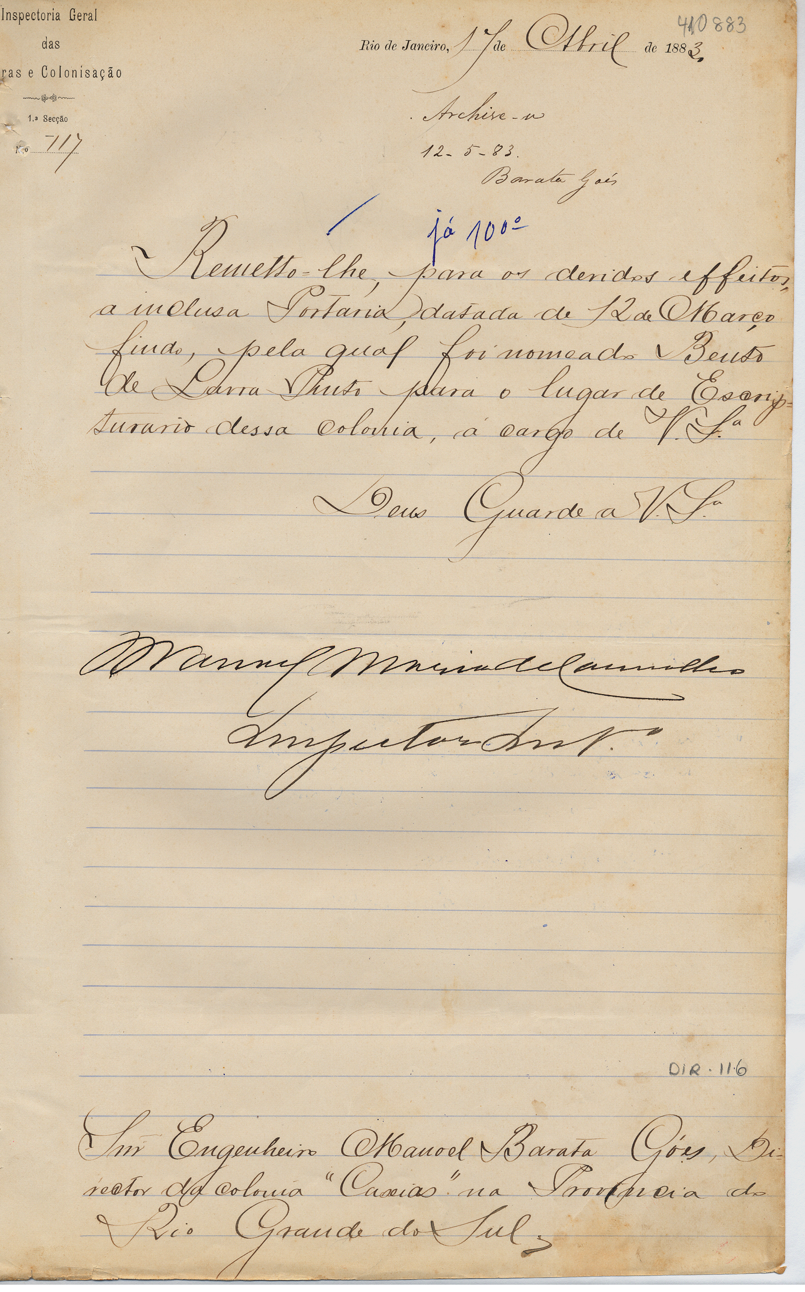 Da Inspetoria Geral das Terras e Colonização - 1ª seção - Manuel Maria de Carvalho - Inspetor interino, para o Engenheiro Manoel Barata Góes - Diretor da Colônia Caxias. Assunto: comunica nomeação de Bento de Lavra Pinto para o cargo de escriturário da colônia.