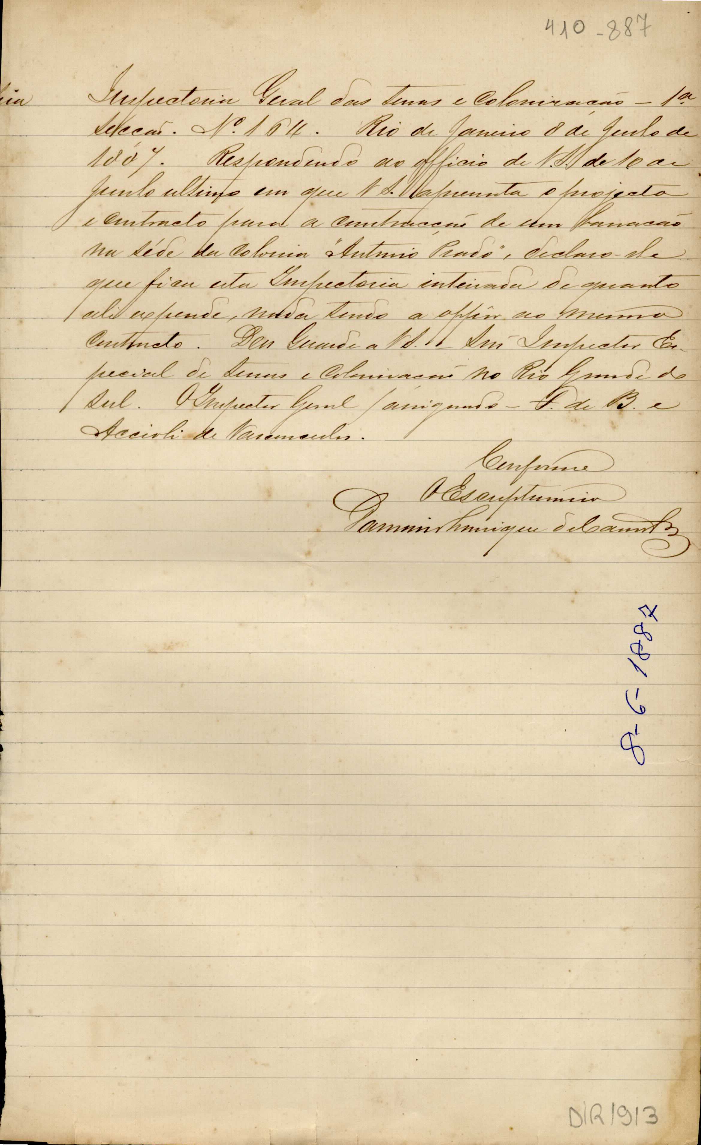 De Francisco de Barros e Accioli de Vasconcellos - Inspetor Geral das Terras e Colonização no RJ, para Henrique Christino da Silva Guerra - Engenheiro Chefe de Medições na ex-Colônia Caxias. Assunto: comunica resposta ao projeto da construção de um barracão na sede da colônia Antonio Prado.