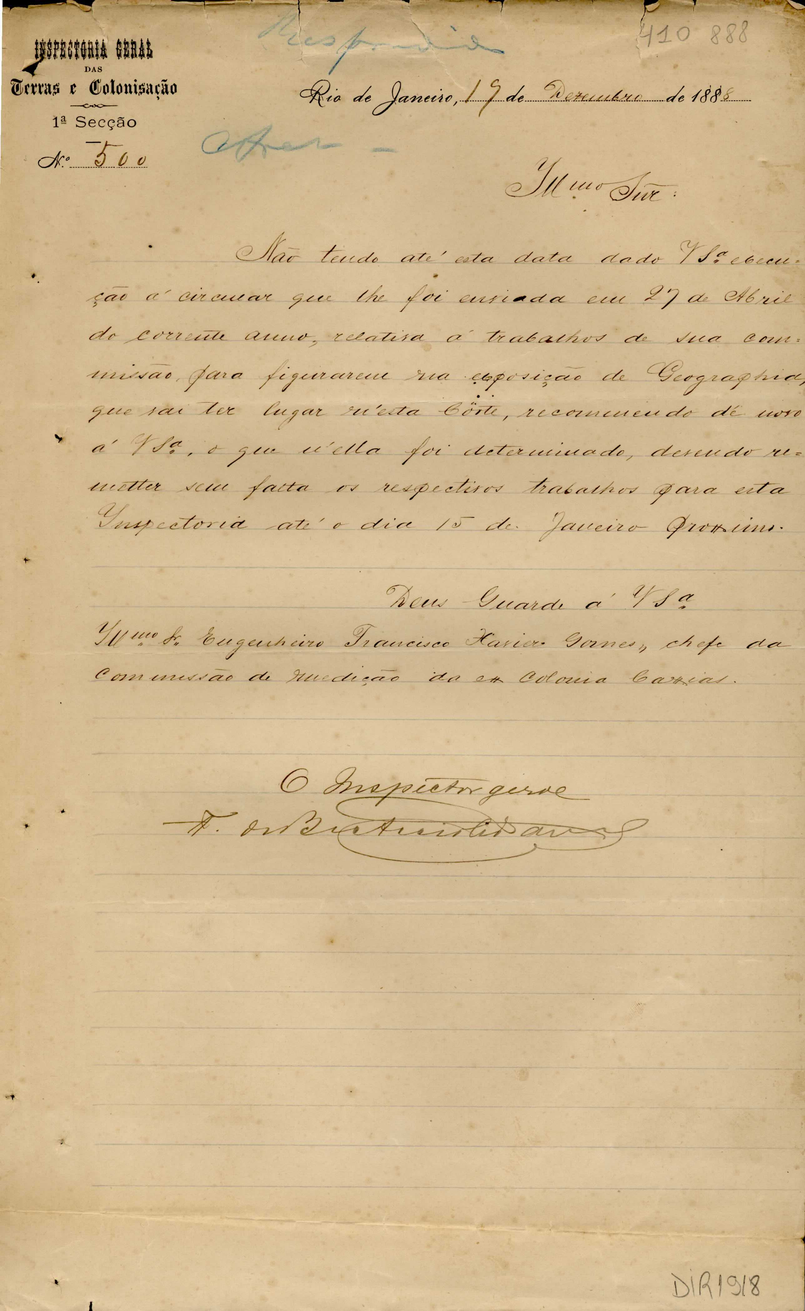 De Francisco de Barros e Accioli de Vasconcellos - Inspetor Geral das Terras e Colonização no RJ, para Francisco Xavier Gomes - Engenheiro Chefe de Medições na ex-Colônia Caxias. Assunto: solicita remessa de trabalhos da Comissão para a Exposição de Geografia.