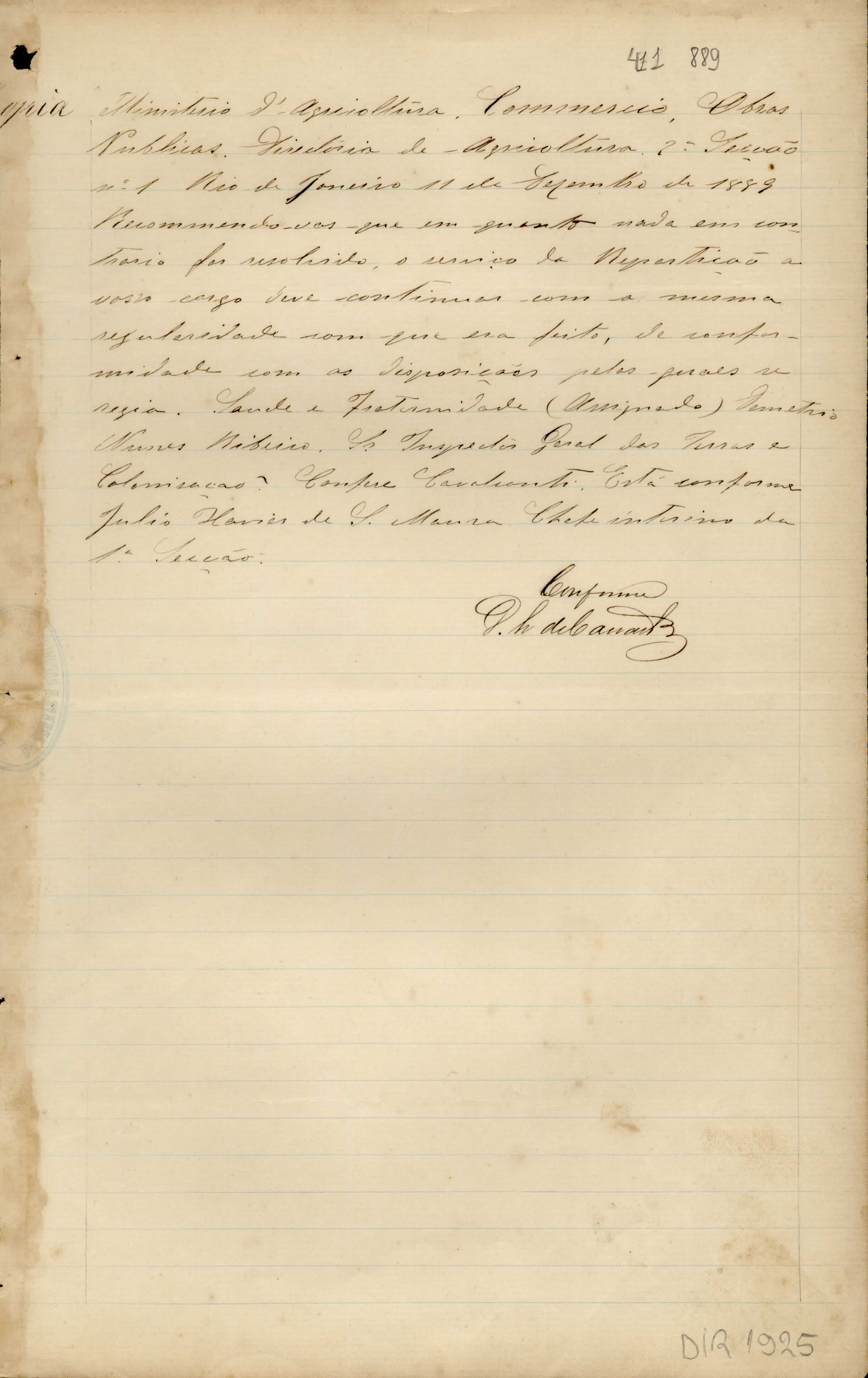 De Demetrio Nunes Ribeiro - Ministério da Agricultura, Comércio, Obras Públicas - Diretoria de Agricultura, para a Inspetoria Geral das Terras e Colonização no RJ. Assunto: recomenda a continuação dos trabalhos da Repartição, com regularidade.