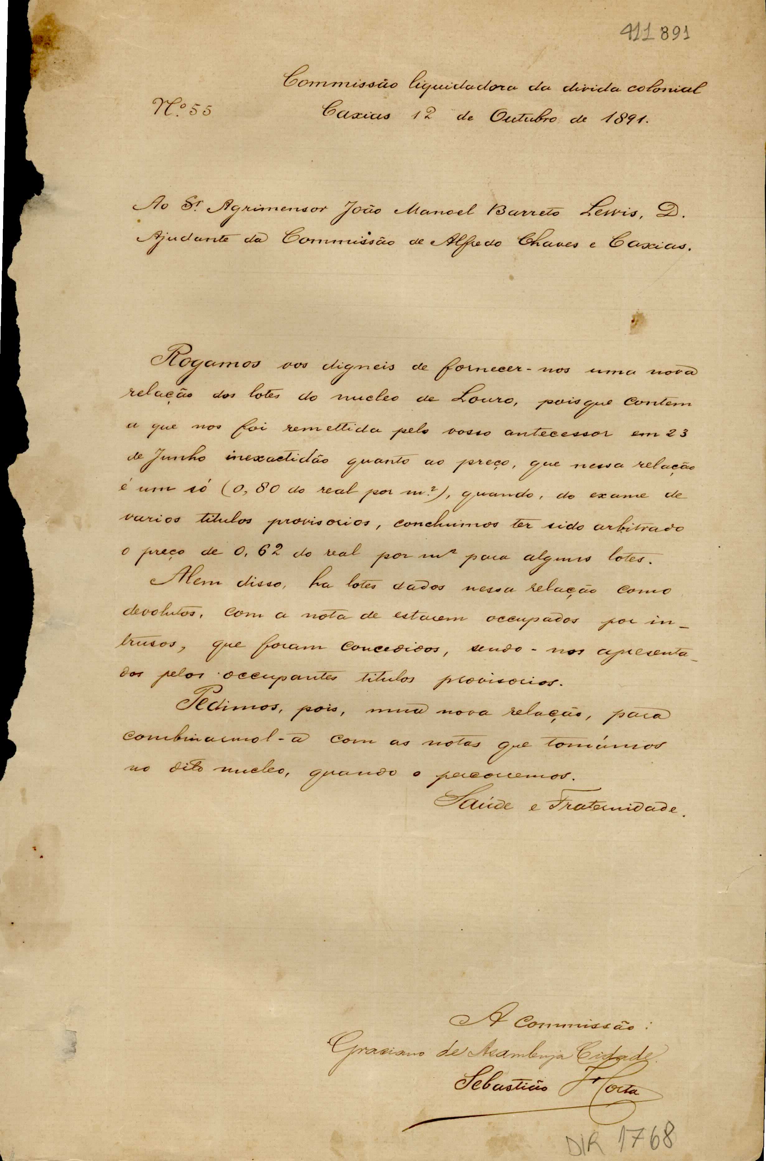 De Sebastião Horta e Graciano Azambuja Cidade - Comissão Liquidadora da Dívida Colonial em Caxias, para João Manoel Barreto Lewis - Ajudante da Comissão de Alfredo Chaves e Caxias. Assunto: solicita fornecimento de uma nova relação dos lotes do núcleo Louro.