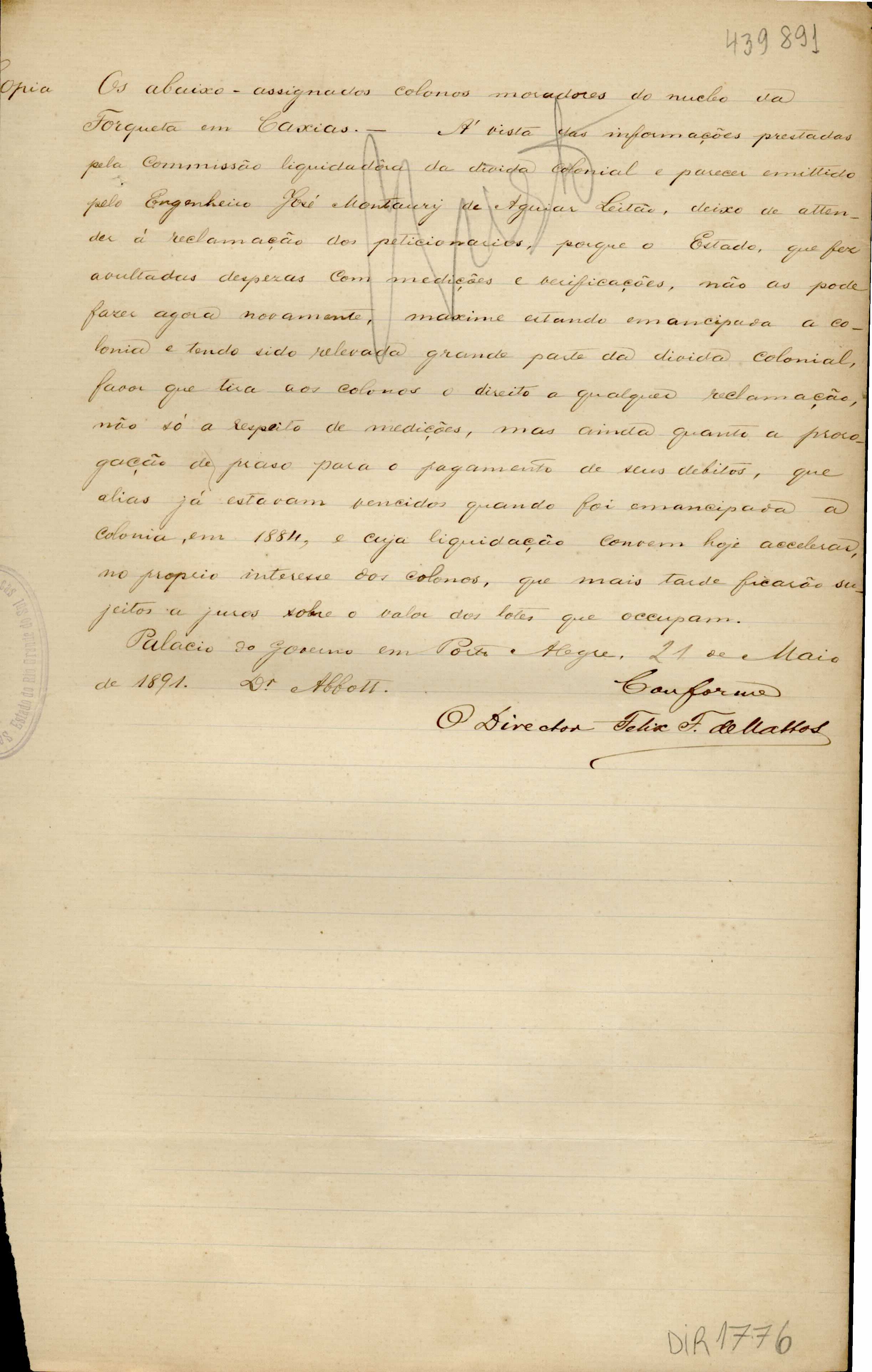 De Felix F. de Mattos - Diretor, para o representante da Comissão Liquidadora de Caxias. Assunto: instruções de como proceder diante da reclamação dos peticionários - colonos moradores no núcleo da Forqueta em Caxias - relativa a medições e verificações: não serão atendidas.