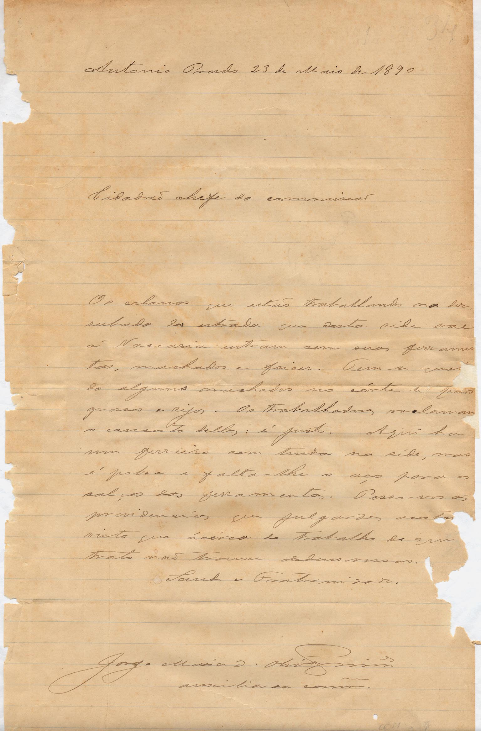 De Jorge Maia de Oliveira Guimarães - Auxiliar da Comissão de Medição de Lotes de Antônio Prado, para o Cidadão Chefe da Comissão em Antônio Prado. Assunto: informa que os colonos têm usado suas ferramentas nos trabalhos da estrada que vai a Vacaria. Solicita machados.