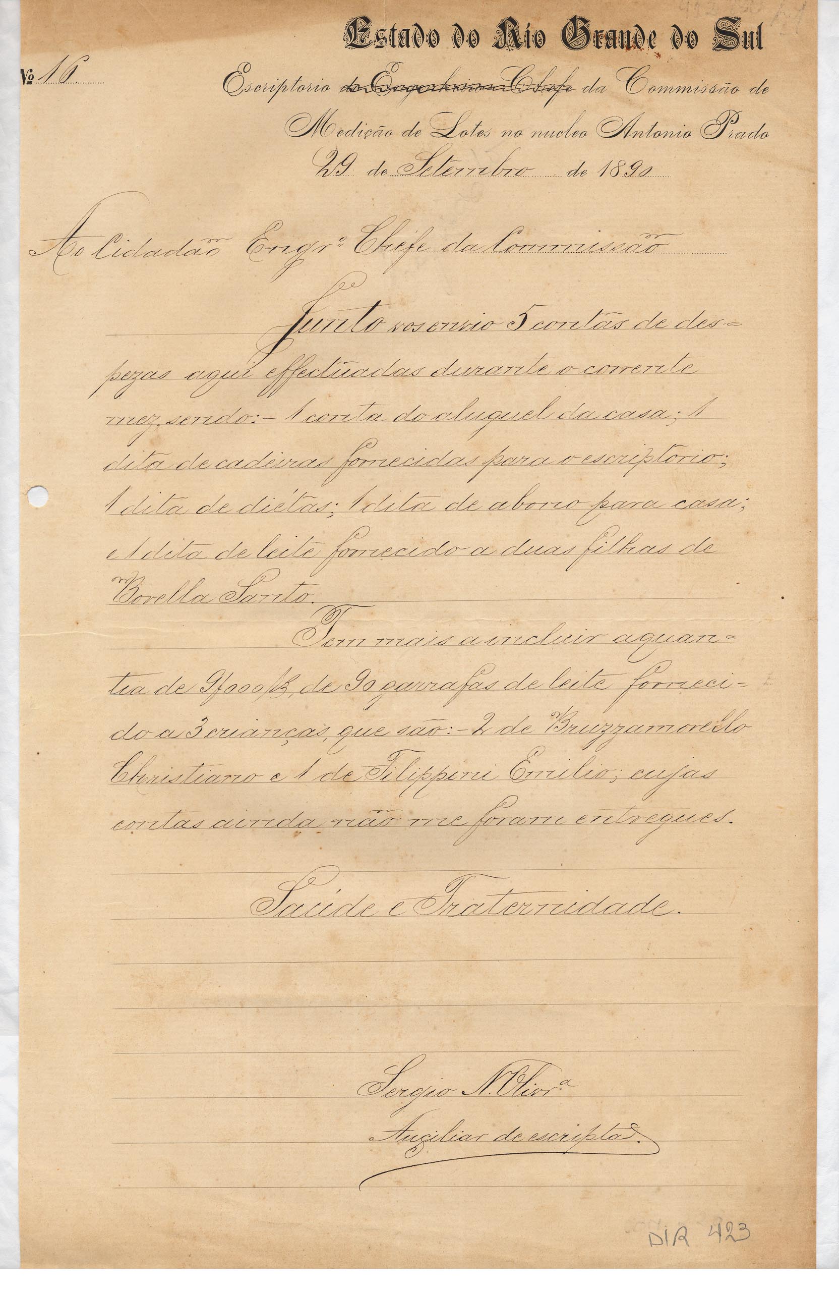 De Sérgio Nogueira de Oliveira - Auxiliar de escrita da Comissão de Medição de Lotes - Antônio Prado, Para o Engenheiro Chefe da mesma Comissão. Assunto: envia cinco contas de despesas efetuadas durante o mês de setembro (aluguel da casa, material de escritório, dietas, abono para casa, leite fornecido às crianças).