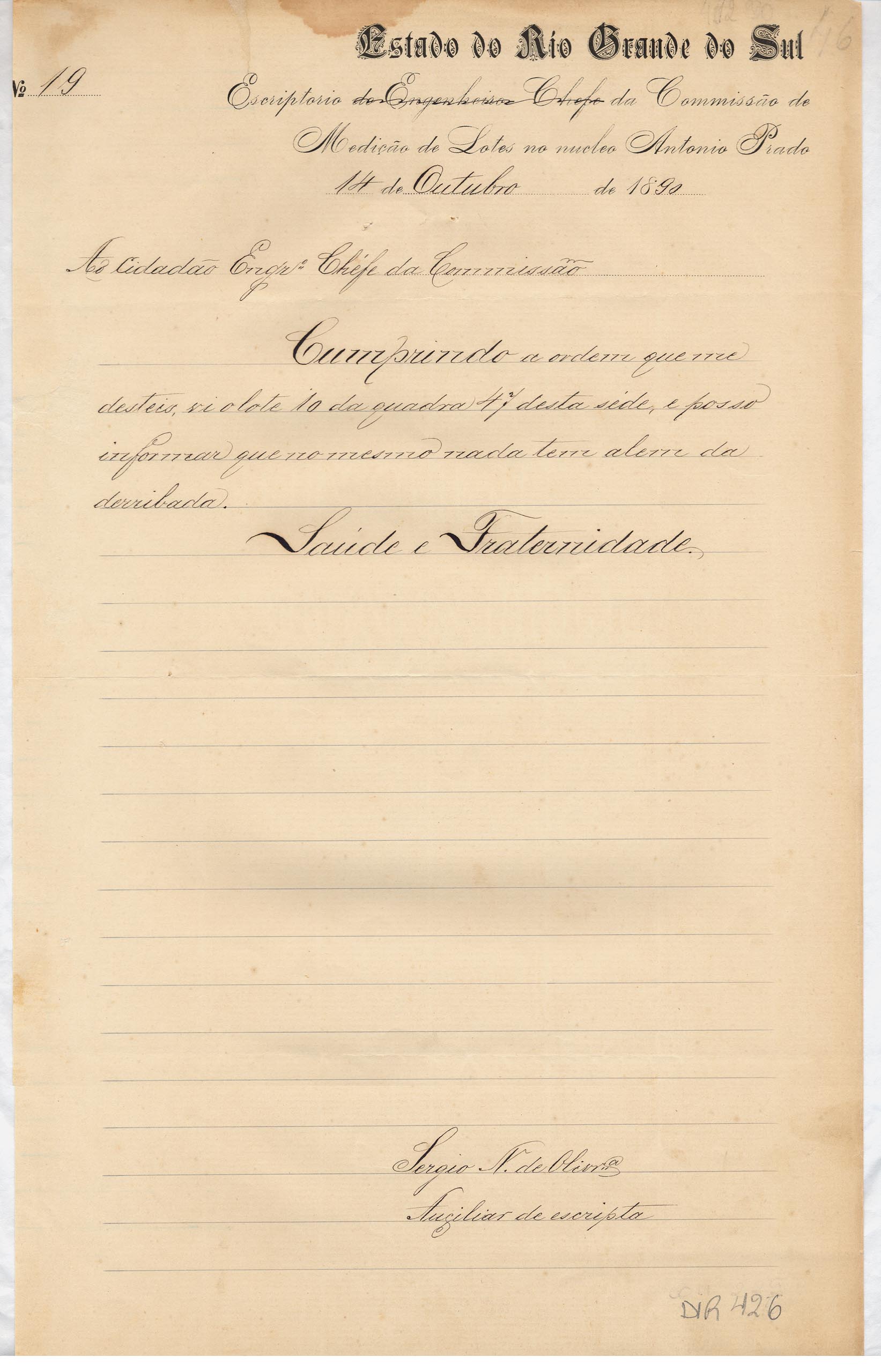 De Sérgio Nogueira de Oliveira - Auxiliar de escrita da Comissão de Medição de Lotes - Antônio Prado, para o Engenheiro Chefe da mesma Comissão. Assunto: informa que não existe nada no lote 10 da quadra 47 da sede.