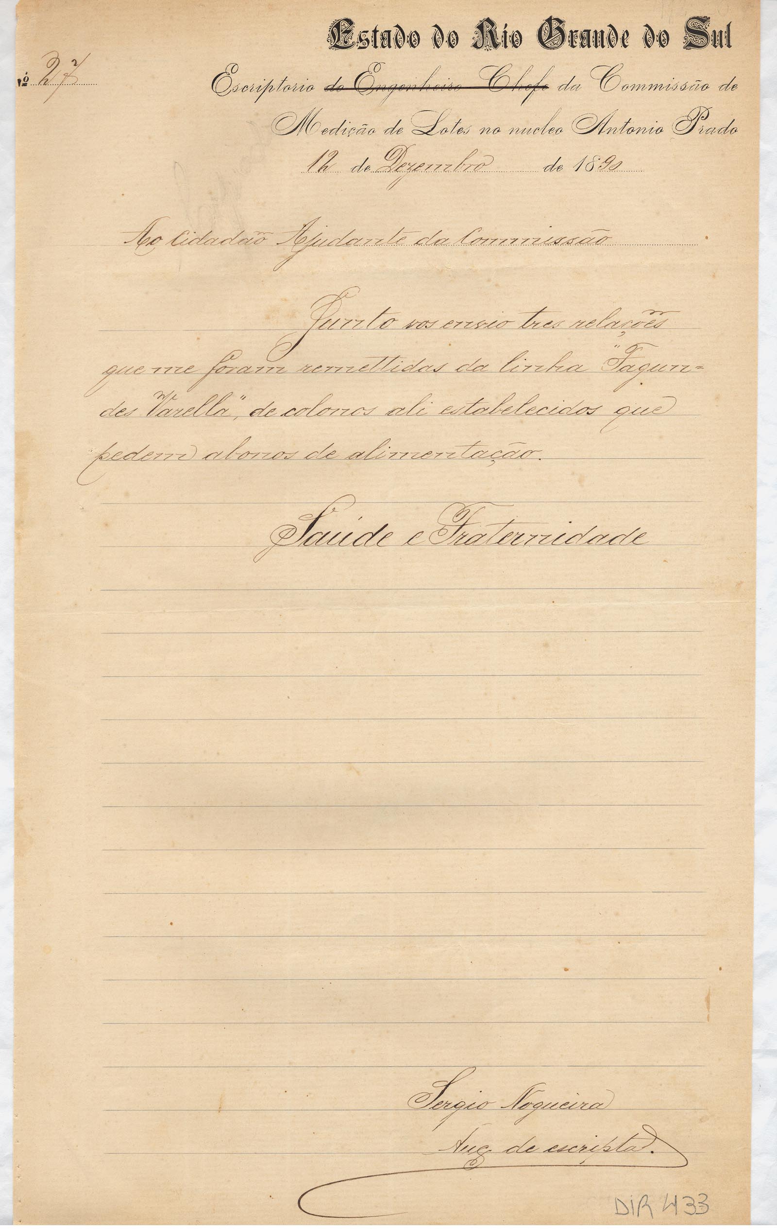 De Sérgio Nogueira de Oliveira - Auxiliar de escrita da Comissão de Medição de Lotes em Antônio Prado, para o Ajudante da mesma Comissão. Assunto: envia relações de pedidos de abonos de alimentação dos colonos da Linha "Fagundes Varella".