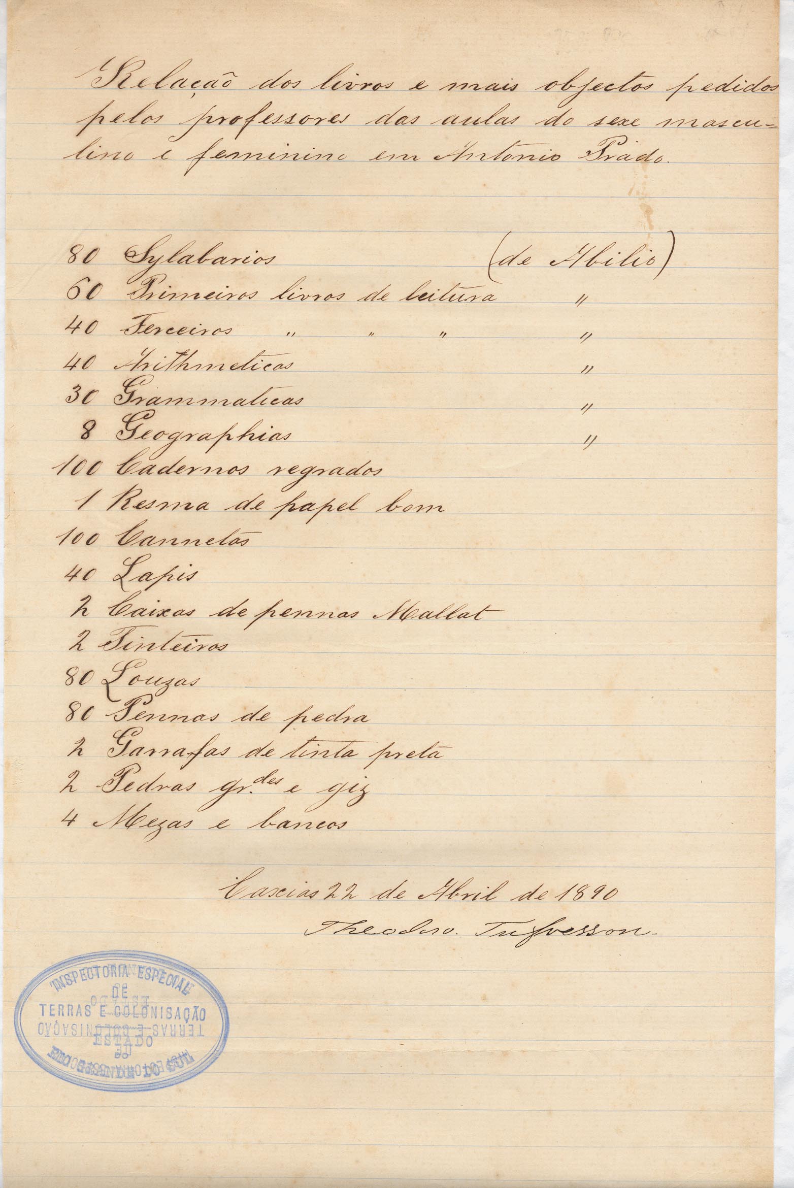Da Inspetoria Especial de Terras e Colonização - Theodoro Tufvesson - Caxias. Assunto: relação dos livros e objetos solicitados para professores das aulas do sexo masculino e feminino em Antônio Prado.