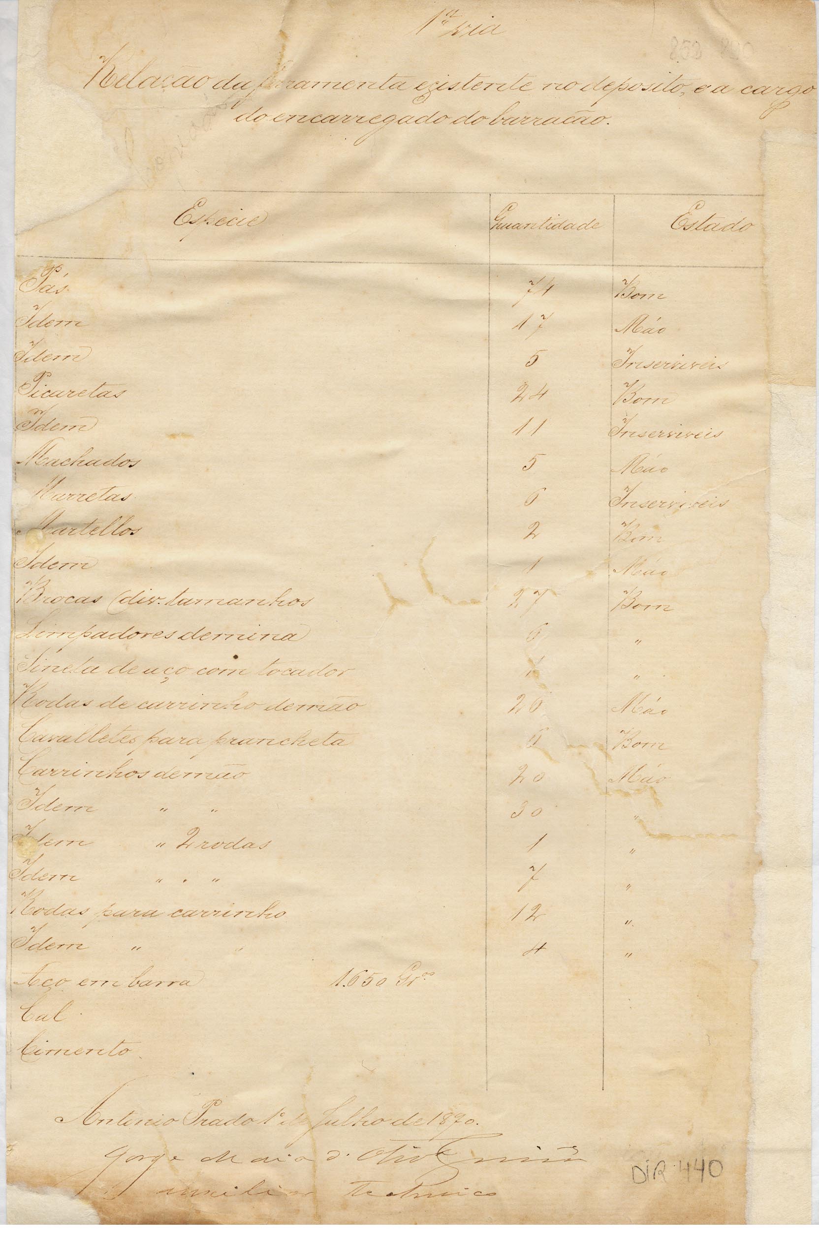 De Jorge Maia de Oliveira Guimarães - Auxiliar Técnico em Antônio Prado. Assunto: relação das ferramentas existentes no depósito e a cargo do encarregado do Barracão dos imigrantes.