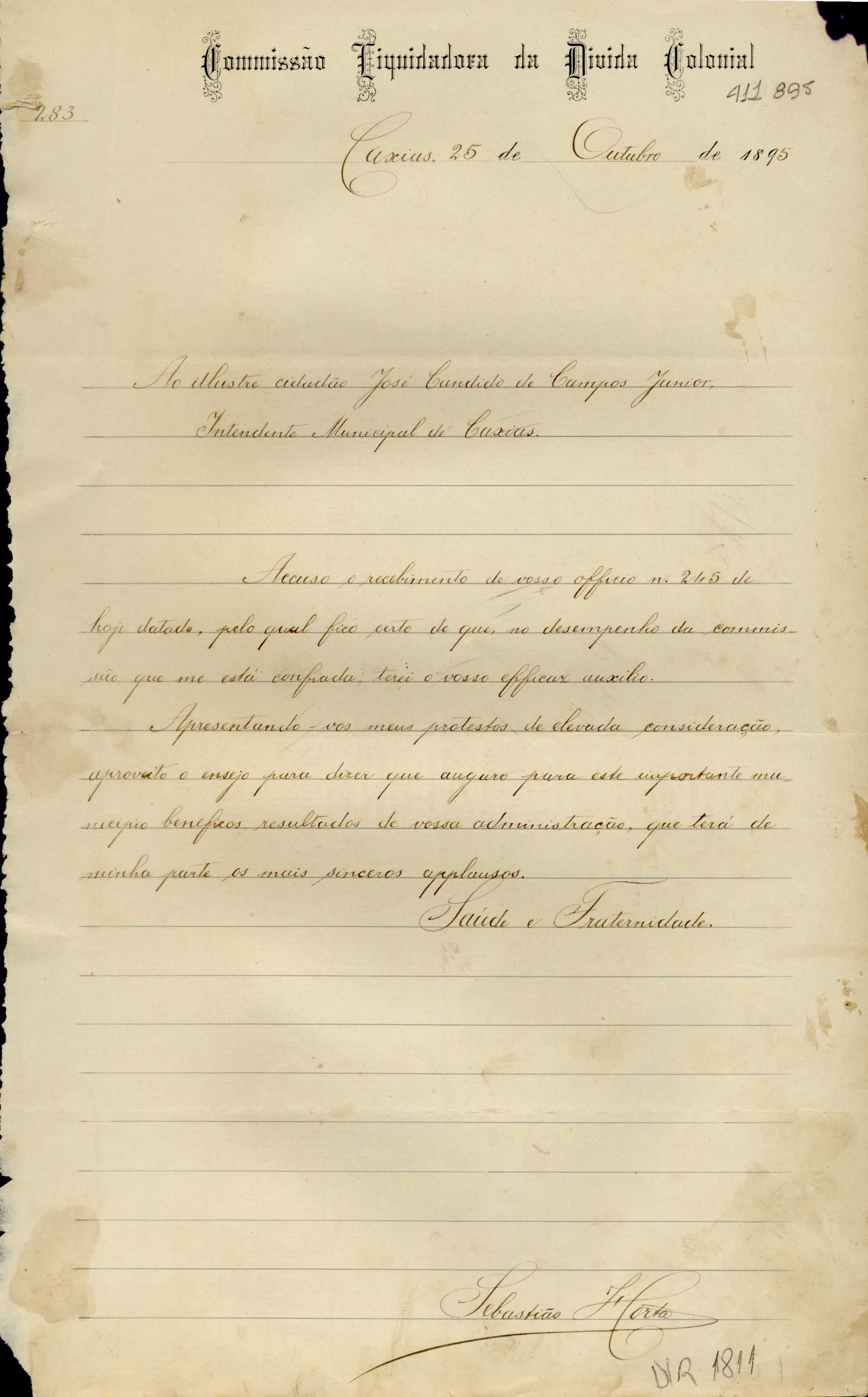 De Sebastião Horta - Encarregado da Comissão Liquidadora da Dívida Colonial - Caxias, para José Cândido de Campos Júnior - Intendente Municipal de Caxias. Assunto: comunica recebimento de ofício, deseja bons resultados na administração do município.