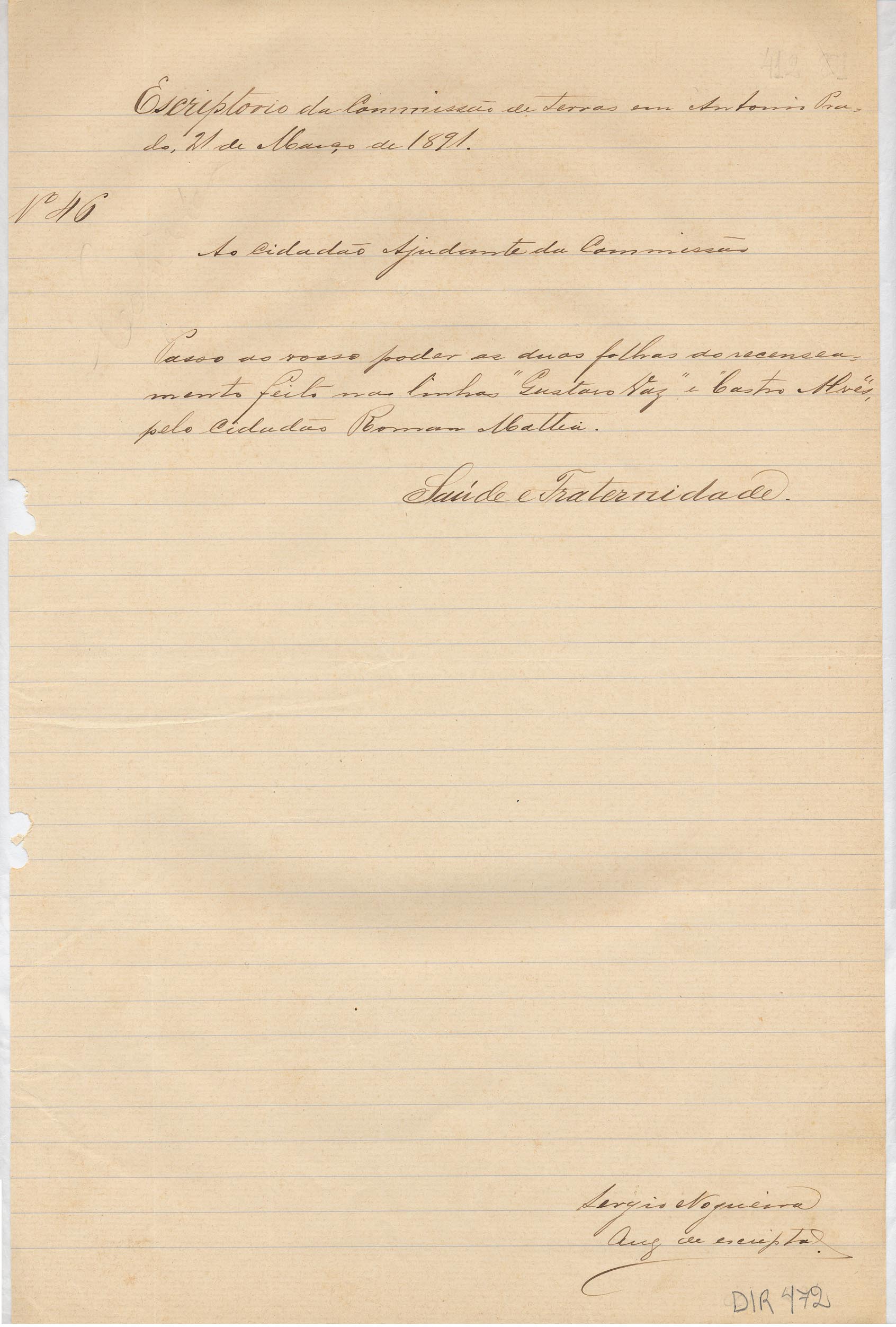 De Sérgio Nogueira - Auxiliar de Escrita da Comissão de Terras em Antonio Prado, para o Ajudante da Comissão. Assunto: comunica envio das duas folhas do recenseamento das linhas Gustavo Vaz e Castro Alves, para Roman Mattia.