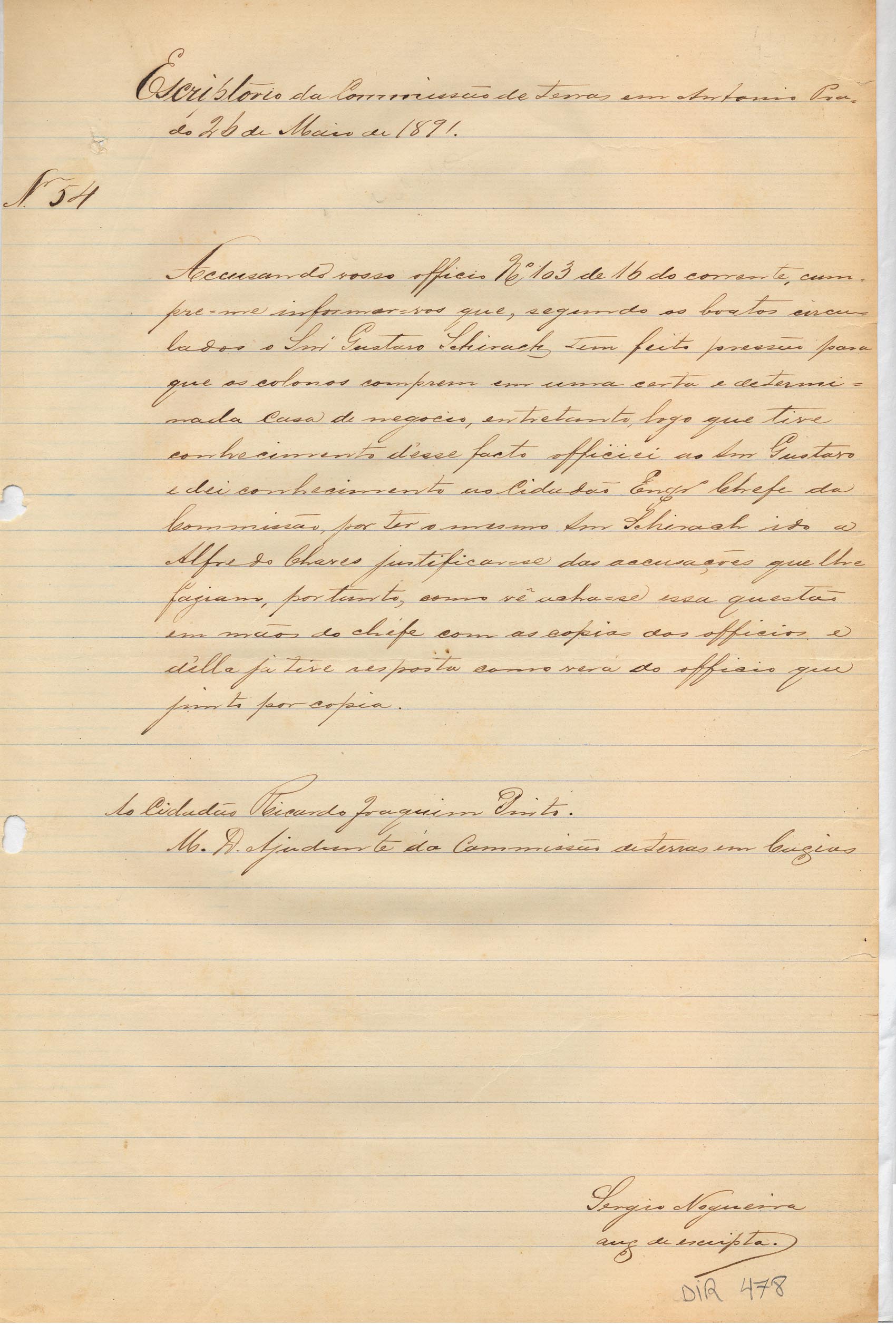 De Sérgio Nogueira - Auxiliar de Escrita da Comissão de Terras em Antonio Prado, para Ricardo Joaquim Pinto - Ajudante da Comissão de Terras em Caxias. Assunto: informa sobre acusação de que Gustavo Shirach pressiona os colonos para comprarem em determinada casa de negócio.