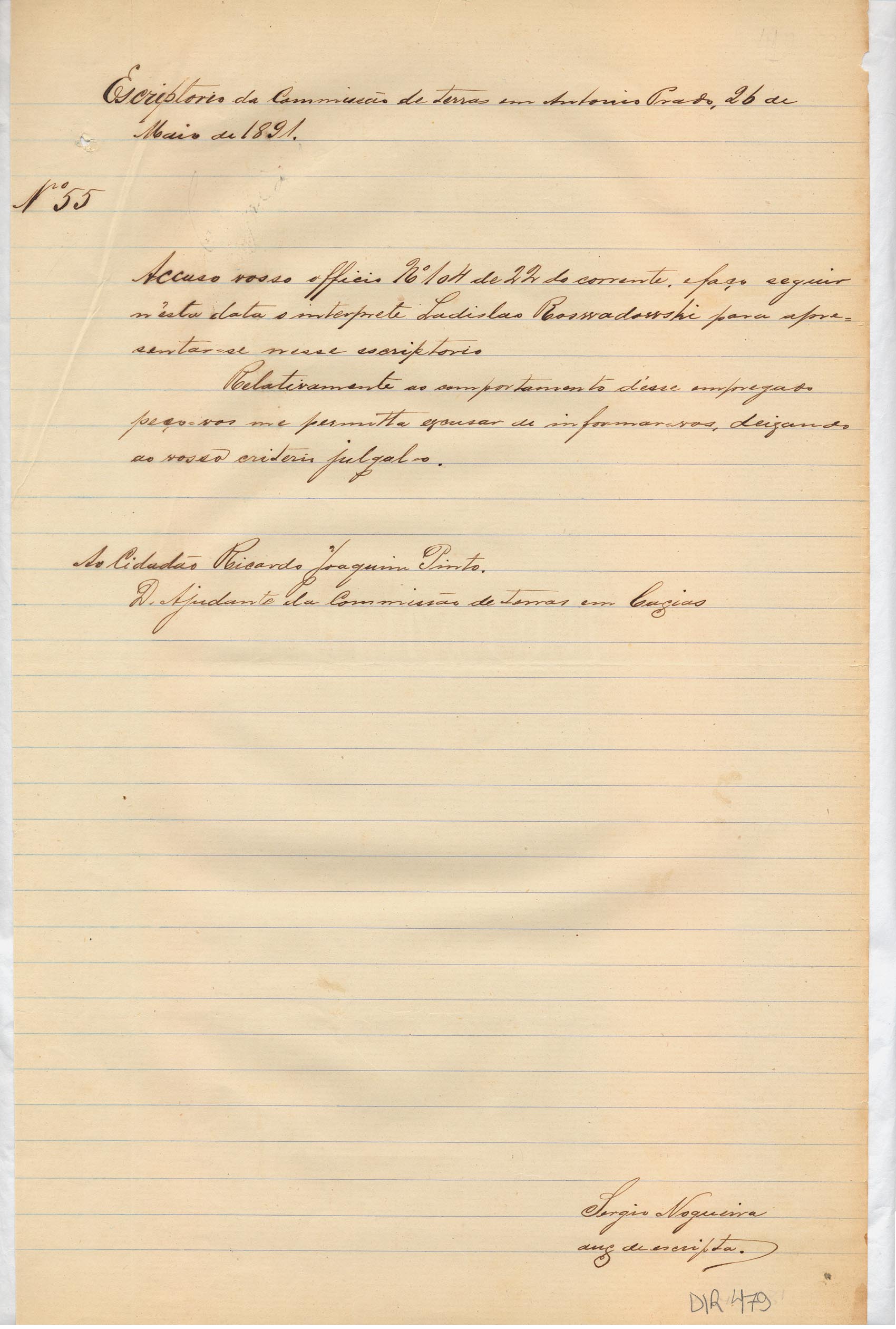 De Sérgio Nogueira - Auxiliar de Escrita da Comissão de Terras em Antonio Prado, para Ricardo Joaquim Pinto - Ajudante da Comissão de Terras em Caxias. Assunto: encaminha o intérprete Ladislao Roswadowski para apresentar-se ao escritório.