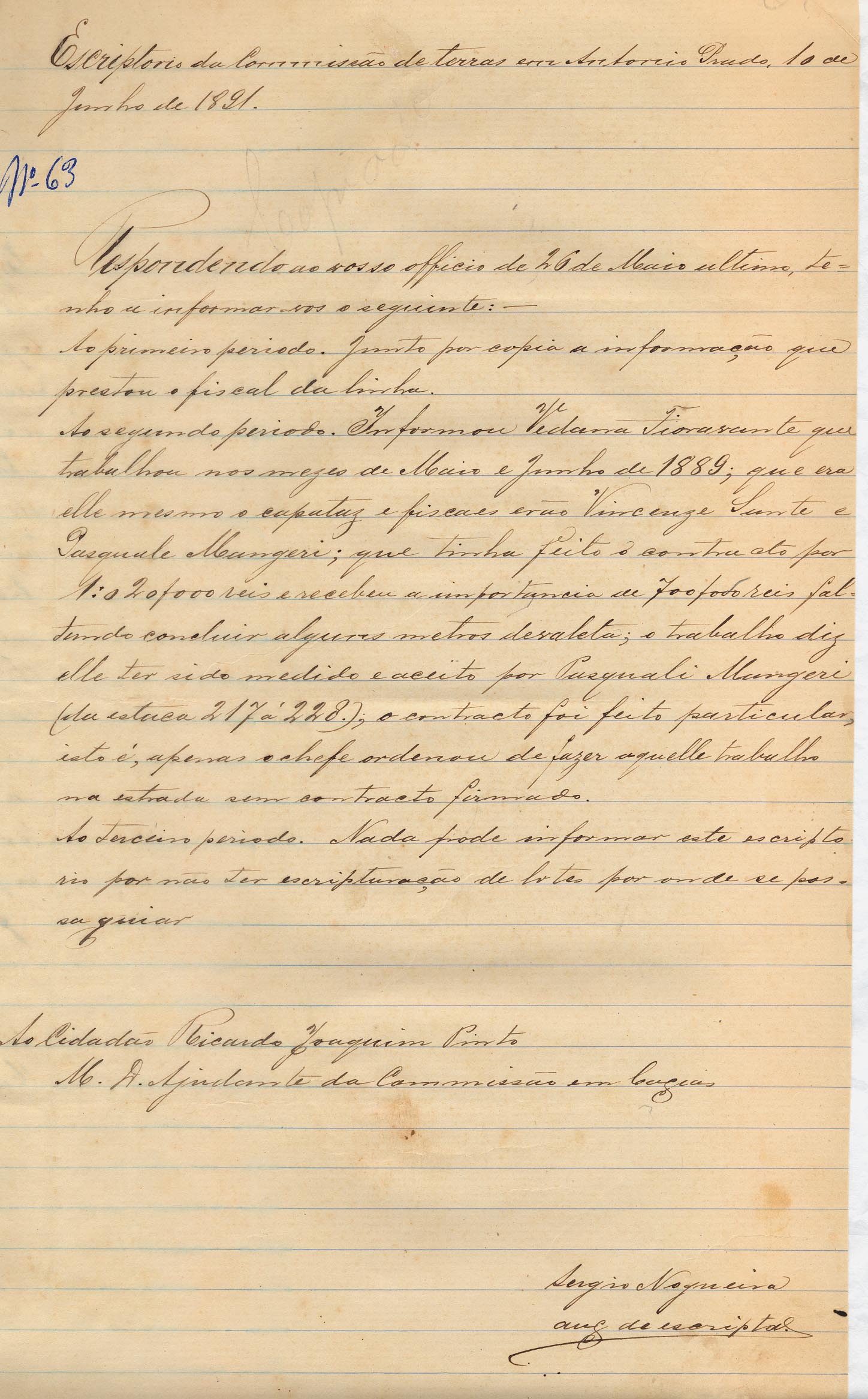 De Sérgio Nogueira - Auxiliar de Escrita da Comissão de Terras em Antonio Prado, para Ricardo Joaquim Pinto - Ajudante da Comissão em Caxias. Assunto: comunica resposta a ofício, informando sobre o trabalho do capataz e fiscais: Vedana Fioravante, Vincenze Sante e Pasquale Mangeri.