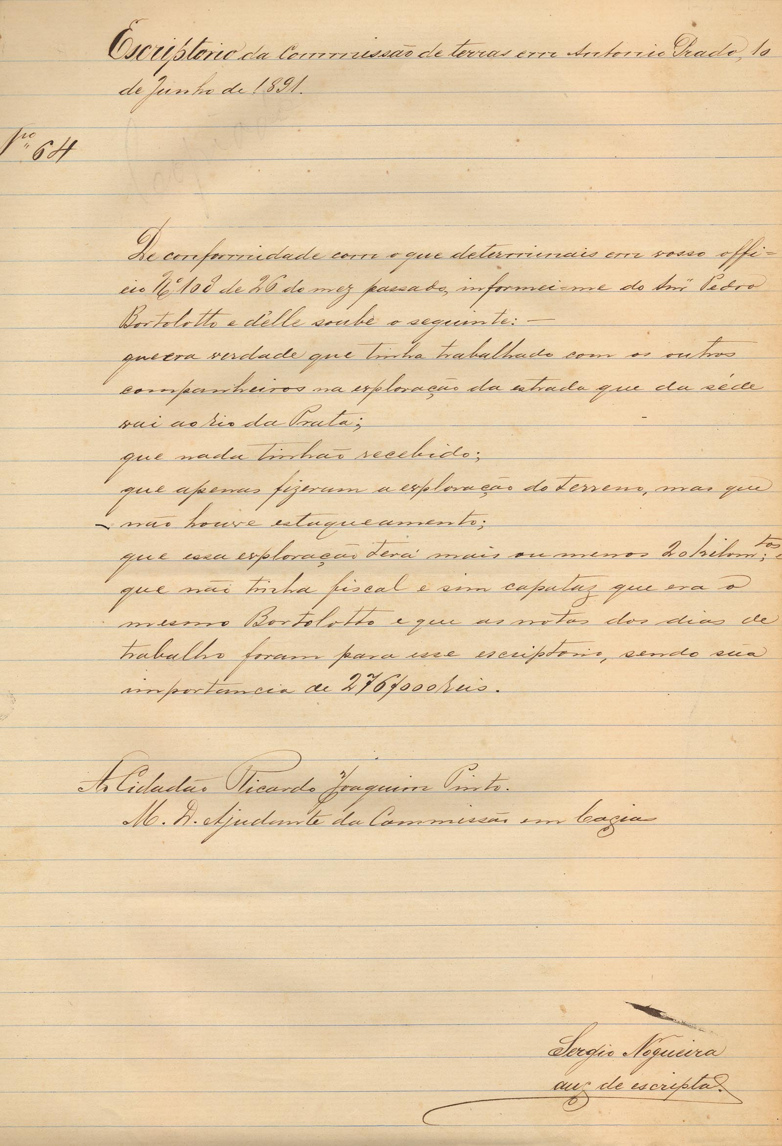 De Sérgio Nogueira - Auxiliar de Escrita da Comissão de Terras em Antonio Prado, para Ricardo Joaquim Pinto - Ajudante da Comissão em Caxias. Assunto: informa sobre o serviço de Pedro Bortolotto, na estrada que vai da sede ao Rio da Prata.