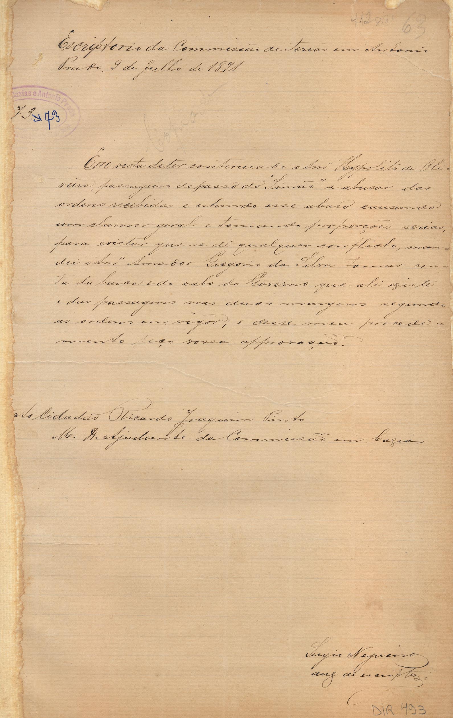 De Sérgio Nogueira - Auxiliar de Escrita da Comissão de Terras em Antonio Prado, para Ricardo Joaquim Pinto - Ajudante da Comissão em Caxias. Assunto: informa que continuam os abusos do Sr. Hypolito de Oliveira, passageiro do passo do Simão, tomando proporções sérias; solicita aprovação para colocar o Sr. Amador Gregório da Silva para tomar conta da barca.