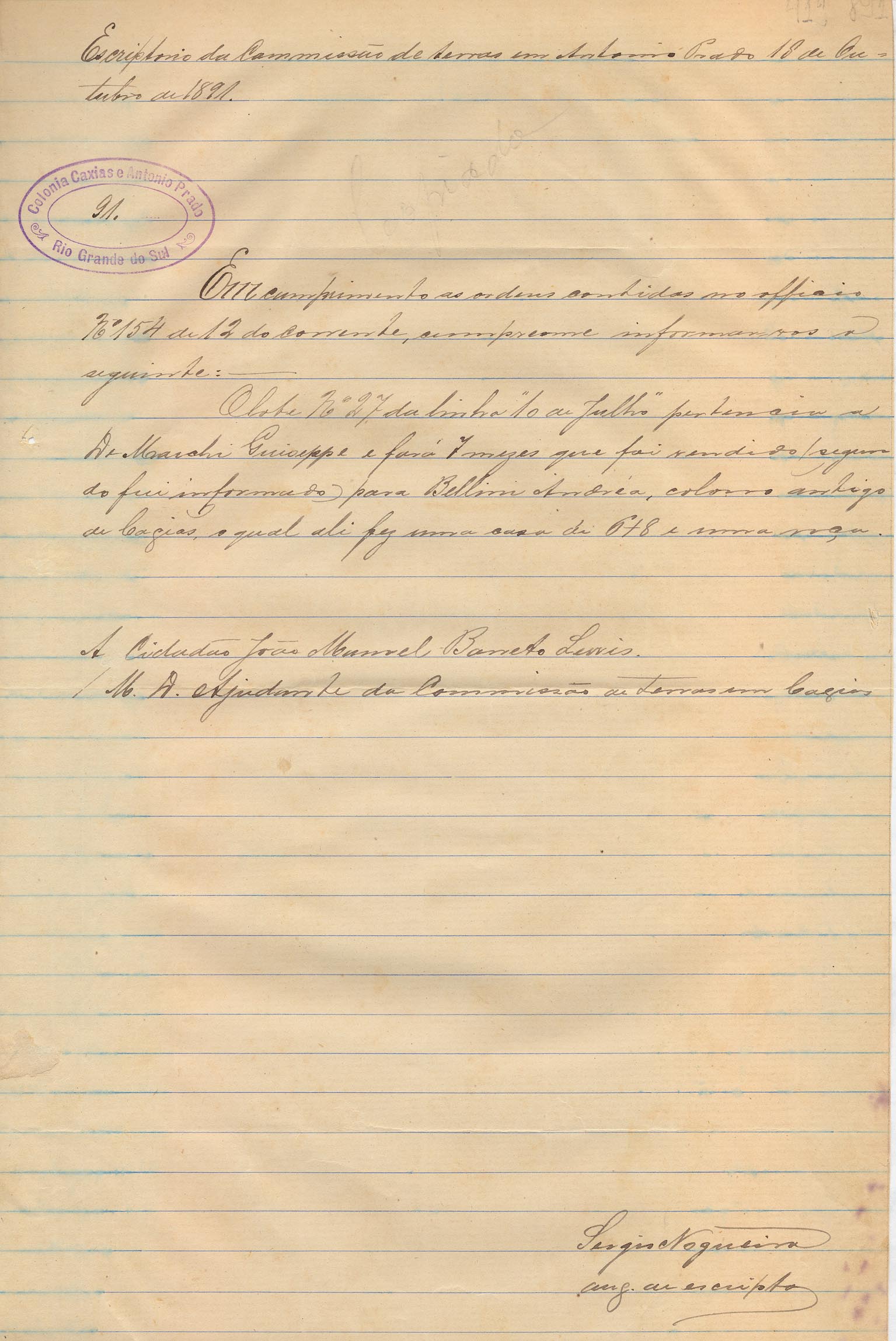 De Sérgio Nogueira - Auxiliar de Escrita da Comissão de Terras em Antonio Prado, para João Manuel Barreto Lewis - Ajudante da Comissão de Terras em Caxias. Assunto: informa que o lote nº 27 da linha 10 de Julho, que pertencia ao Dr. Giuseppe Marchi, foi vendido há sete meses para Andréa Bellini.
