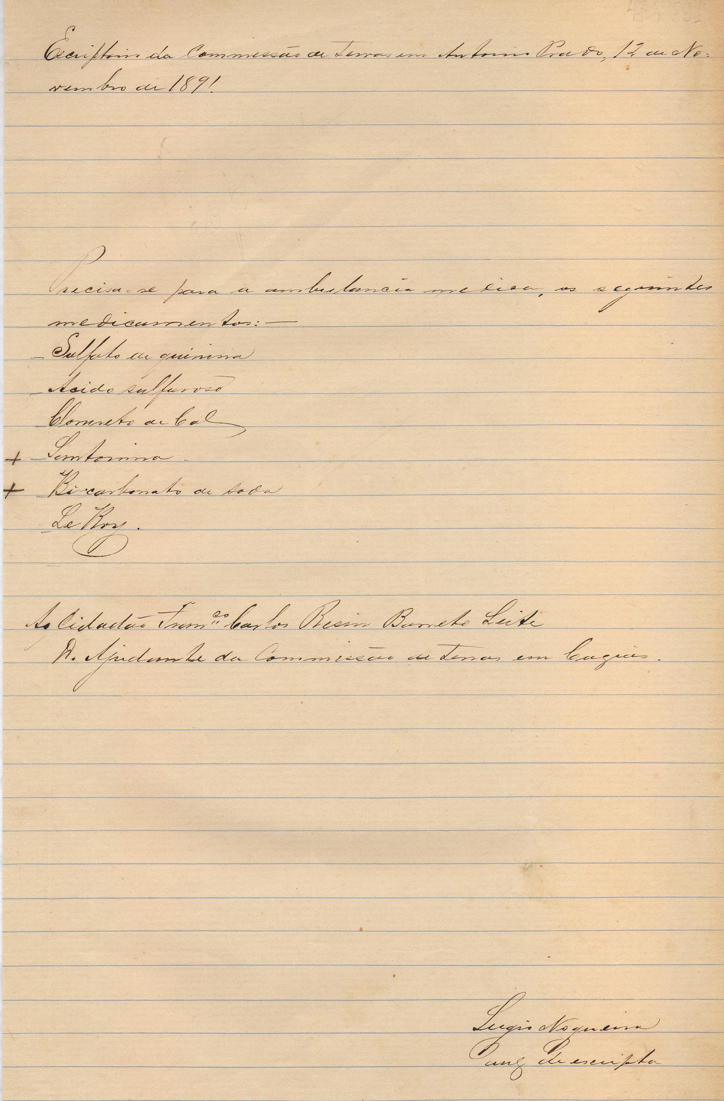 De Sérgio Nogueira - Auxiliar de Escrita da Comissão de Terras em Antonio Prado, para Francisco Carlos Resin Barreto Leite - Ajudante da Comissão de Terras em Caxias. Assunto: solicita medicamentos para a ambulância médica.