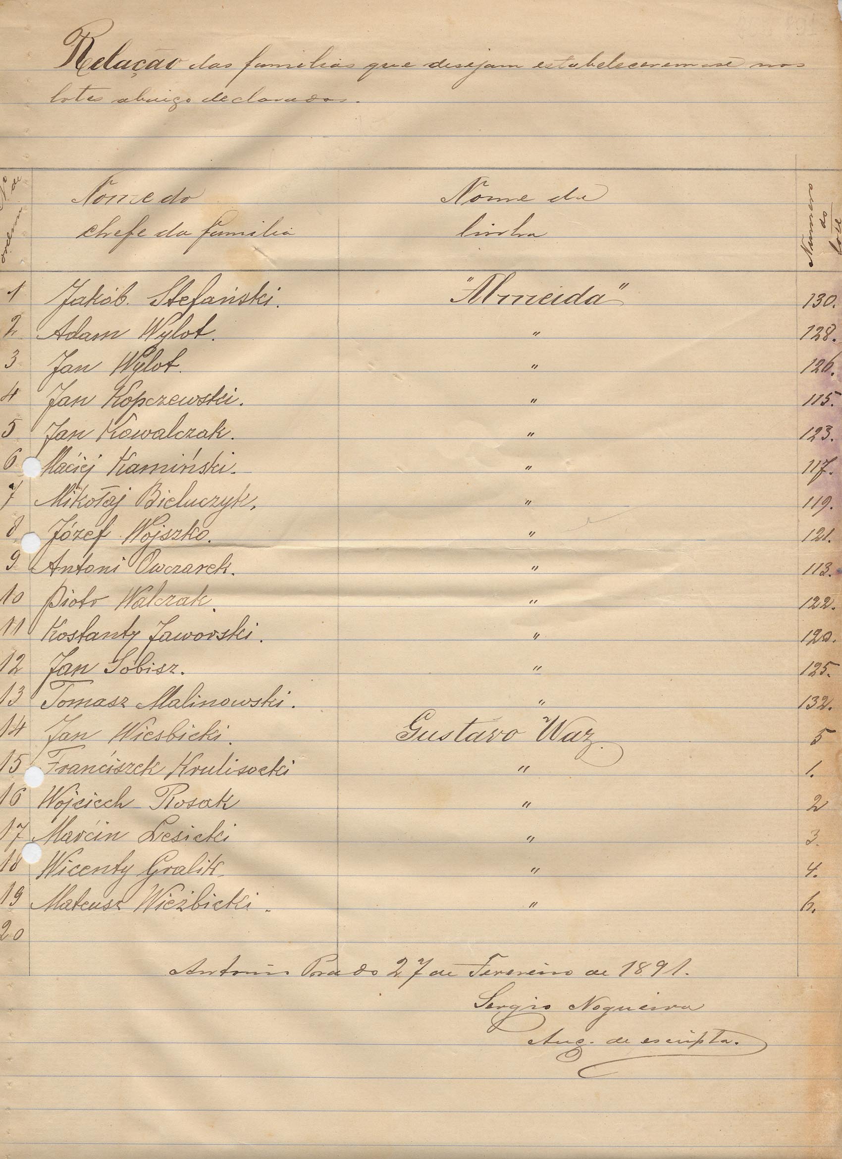 De Sérgio Nogueira - Auxiliar de Escrita da Comissão de Terras em Antonio Prado. Assunto: relação de famílias que desejam se estabelecer nos lotes das linhas Almeida e Gustavo Waz.