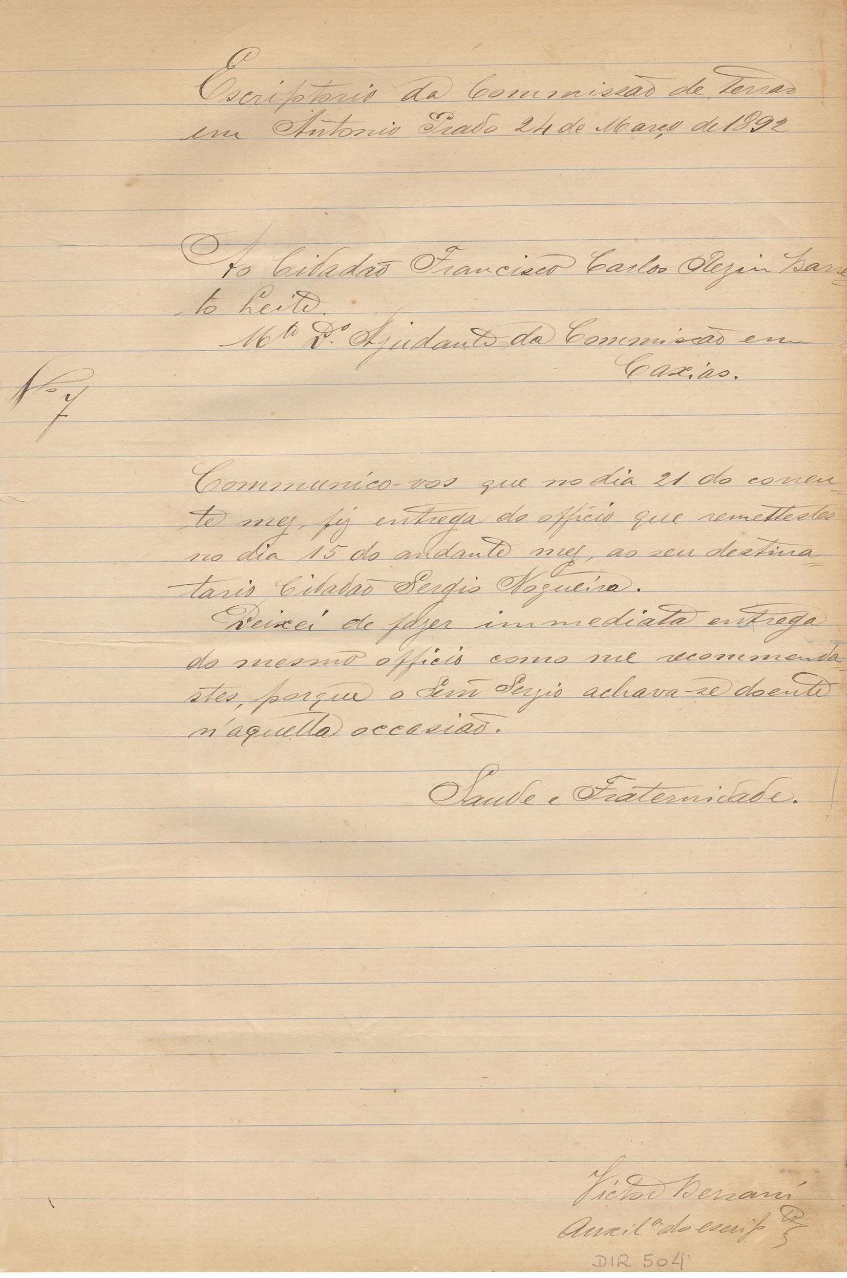 De Victor Bersani - Auxiliar da Comissão de Terras em Antonio Prado, para Francisco Carlos Resin Barreto Leite - Ajudante da Comissão em Caxias. Assunto: comunica que já entregou o ofício ao Sr. Sérgio Nogueira.