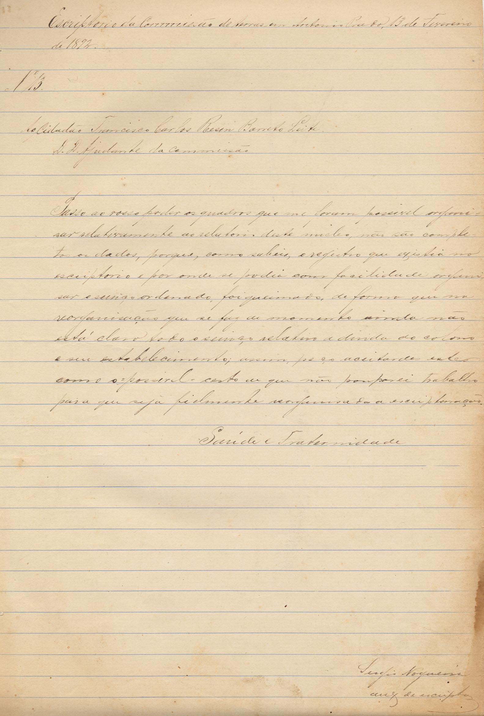 De Sérgio Nogueira - Auxiliar de Escrita da Comissão de Terras em Antonio Prado, para Francisco Carlos Resin Barreto Leite - Ajudante da Comissão de Terras em Caxias. Assunto: comunica envio dos quadros, com dados incompletos (o registro que existia no escritório foi queimado).