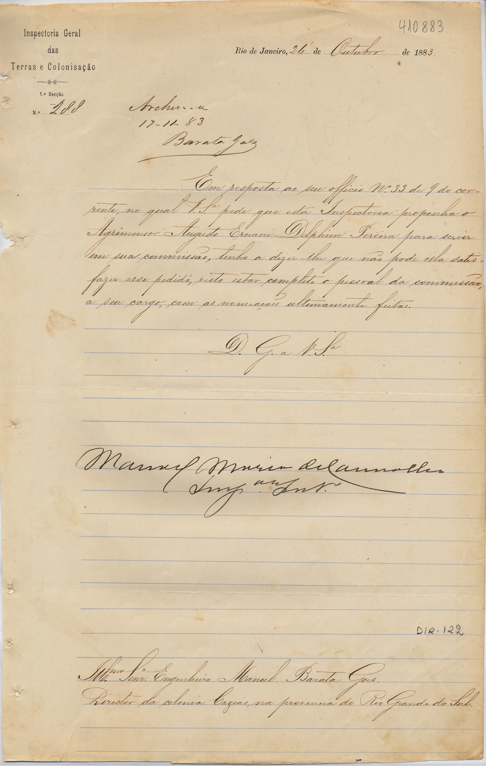 Da Inspetoria Geral das Terras e Colonização - 1ª seção - Manuel Maria de Carvalho - Inspetor interino, para o Engenheiro Manoel Barata Góes - Diretor da Colônia Caxias. Assunto: comunica negação do pedido feito a Inspetoria para nomeação do agrimensor Augusto Ernani Delphim Pereira, em vista do quadro do pessoal da comissão estar completo.