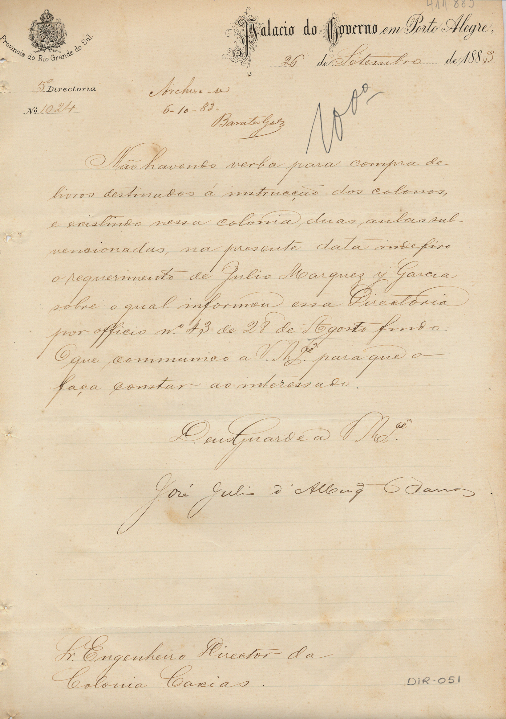 "Do Palácio do Governo - 5ª Diretoria - José Júlio de Albuquerque Barros, para o Engenheiro Diretor da Colônia Caxias. Assunto: comunica falta de verba para compra de livros para instrução dos colonos; indeferimento do requerimento de Júlio Marquez Garcia." Local: Porto Alegre.