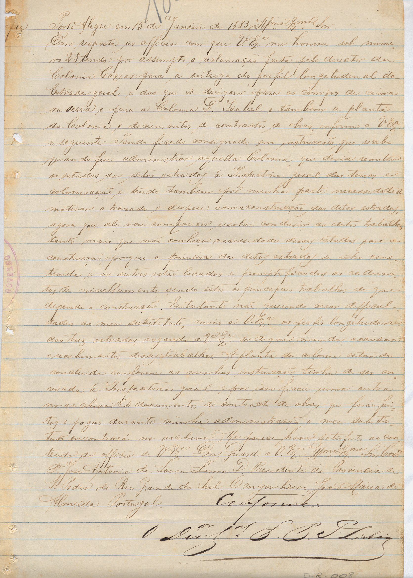 De João Maria de Almeida Portugal - Engenheiro - Chefe da Colônia Caxias, para Dr. José Antonio de Souza Lima - Presidente da Província do RS. Assunto: informações sobre a construção de estradas. Local: Porto Alegre.