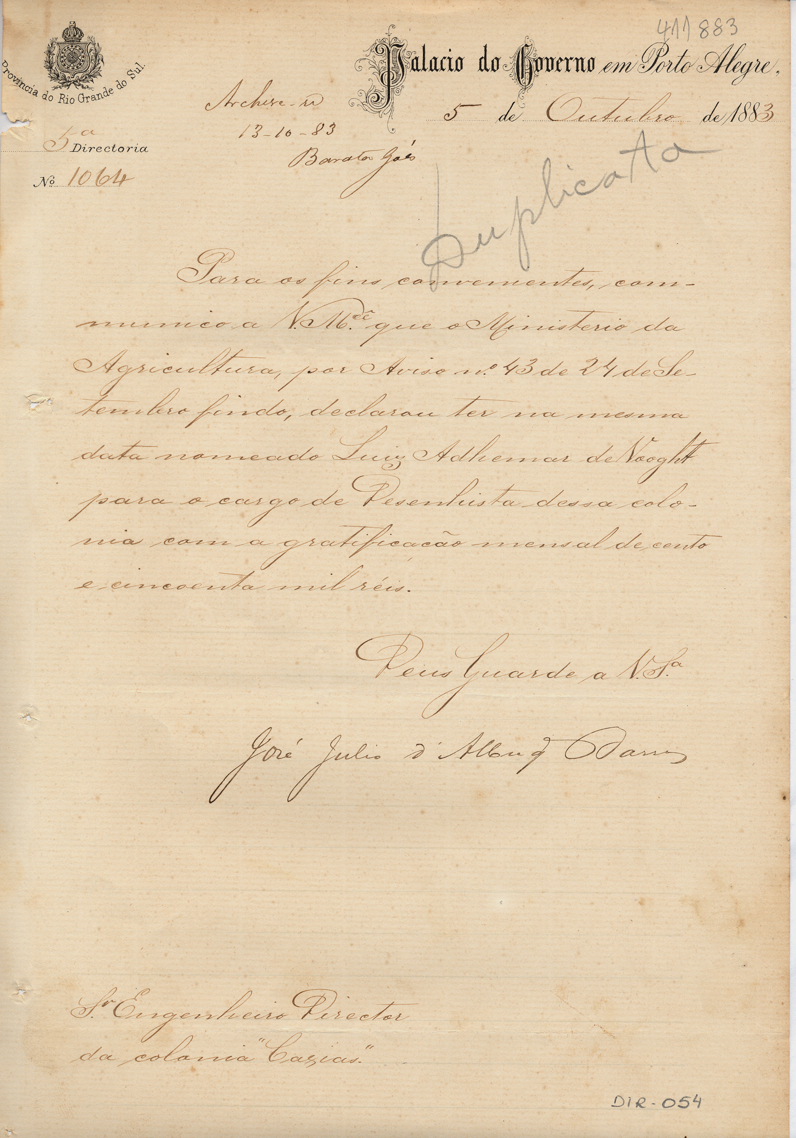 Do Palácio do Governo - 5ª Diretoria - José Júlio de Albuquerque Barros, para o Engenheiro Diretor da Colônia Caxias. Assunto: comunica nomeação de Luiz Ademar de Vooght para o cargo de desenhista da colônia, pelo Ministério da Agricultura. Local: Porto Alegre.