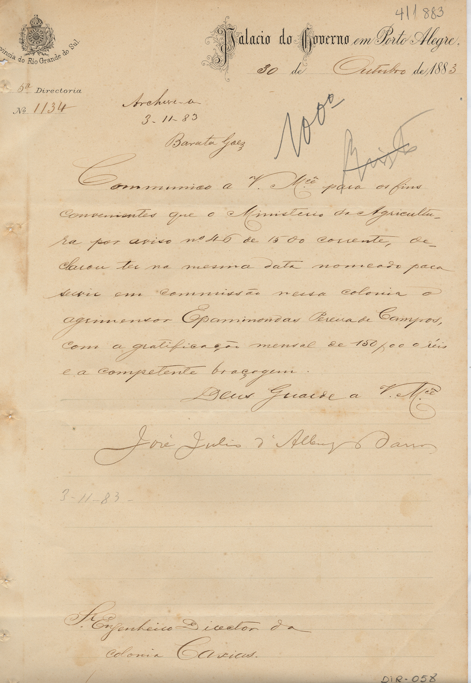 Do Palácio do Governo - 5ª Diretoria - José Júlio de Albuquerque Barros, para o Engenheiro Diretor da Colônia Caxias. Assunto: comunica nomeação do agrimensor Epaminondas Pereira de Campos pelo Ministério da Agricultura, para servir em comissão da colônia. Local: Porto Alegre.