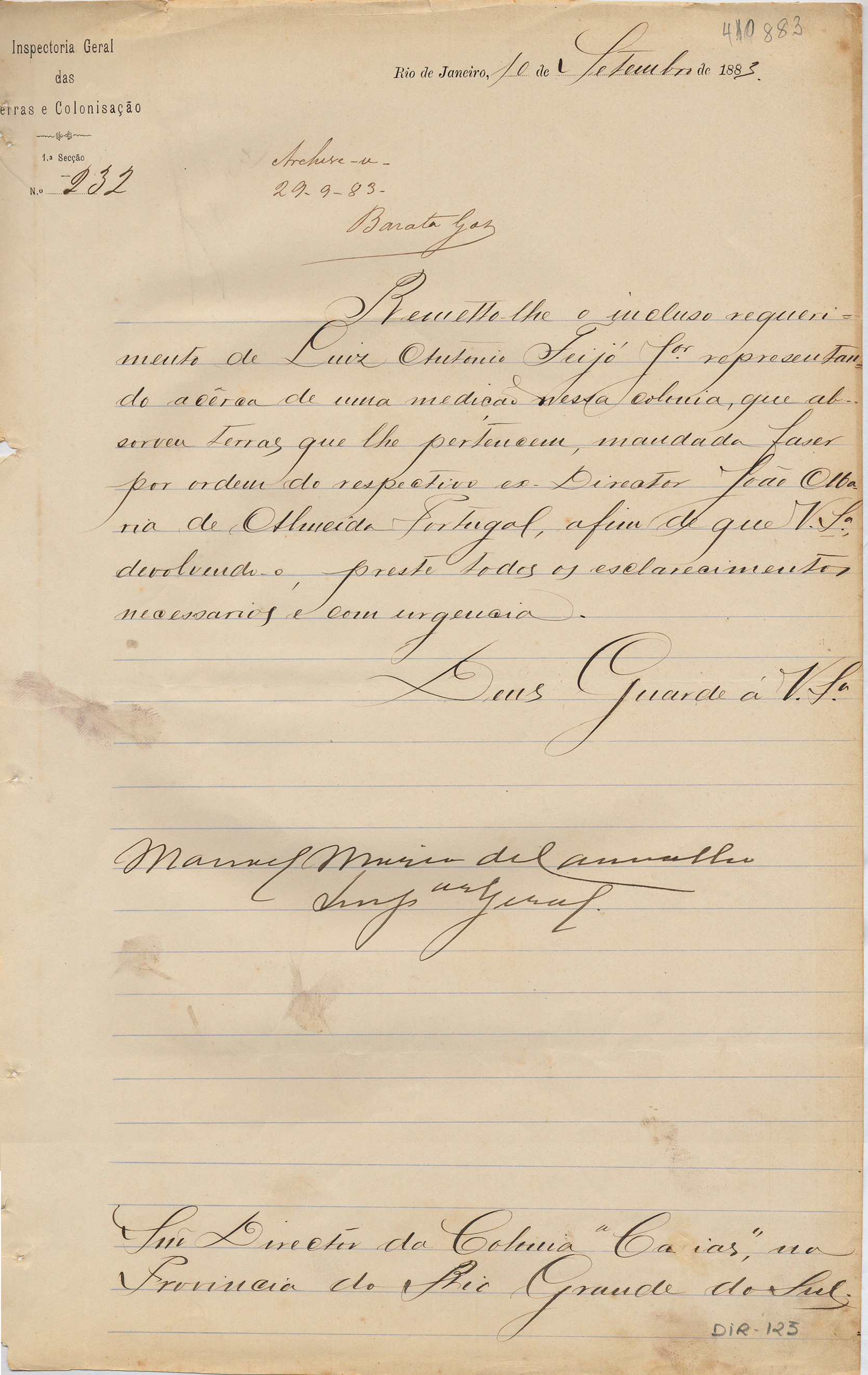 Da Inspetoria Geral das Terras e Colonização - 1ª seção - Manuel Maria de Carvalho - Inspetor Geral interino, para o Engenheiro Manoel Barata Góes - Diretor da Colônia Caxias.Assunto: solicita esclarecimento sobre medição ordenada pelo ex-Diretor, João Maria de Almeida Portugal, que absorveu terras de Luiz Antonio Feijó Jr.