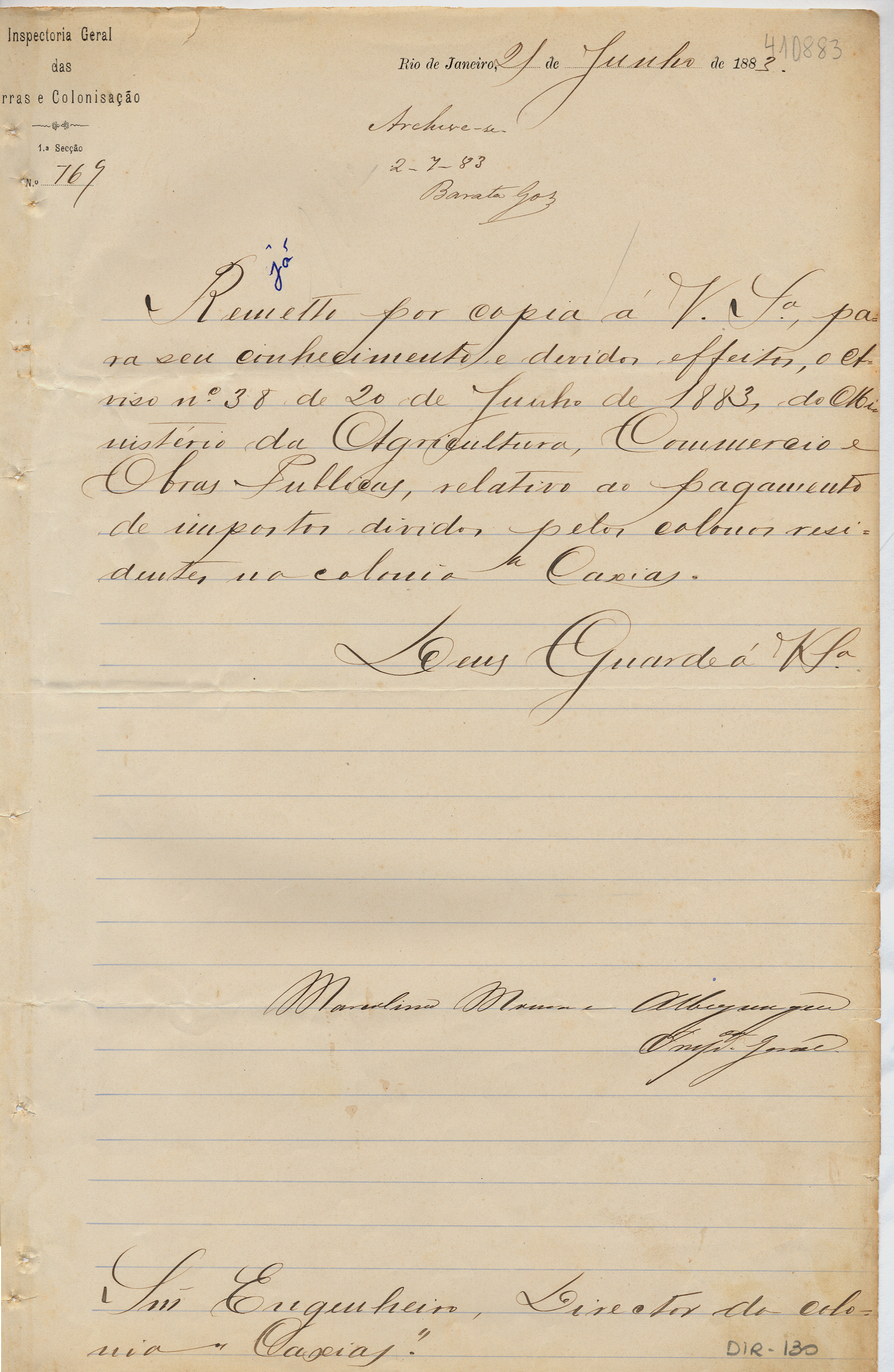 Da Inspetoria Geral das Terras e Colonização - 1ª seção - Marcolino Moura e Albuquerque - Inspetor Geral, para o Engenheiro Manoel Barata Góes - Diretor da Colônia Caxias.Assunto: comunica remessa de aviso do Ministério da Agricultura, Comércio e Obras Públicas, relativo ao pagamento de impostos devidos pelos colonos.